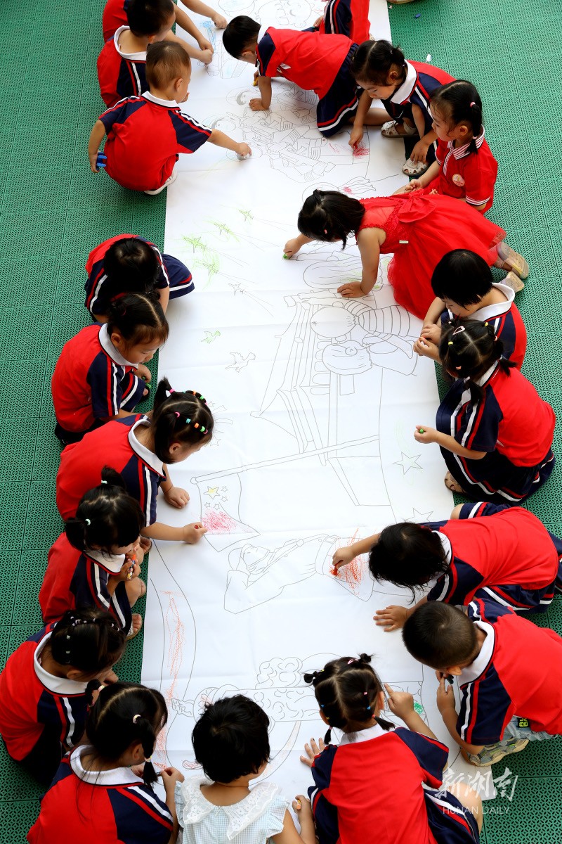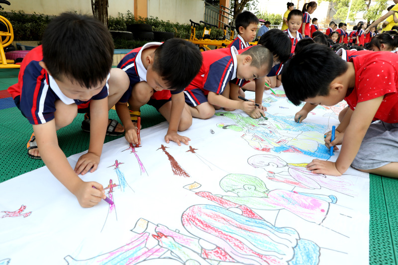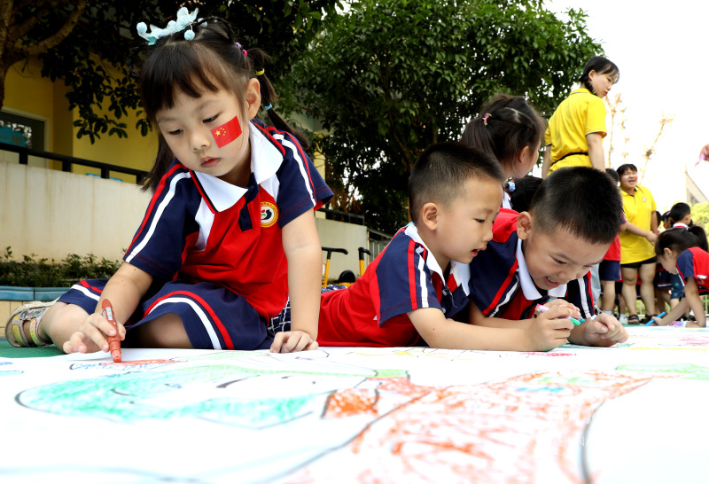 9月30日,衡阳幼儿师范高等专科学校附属幼儿园的小朋友们在长卷上绘画。当天,该幼儿园举行“我爱祖国”迎国庆活动,小朋友在老师的指导下,在长卷上用画笔表达对祖国的热爱和祝福。刘爱成 摄