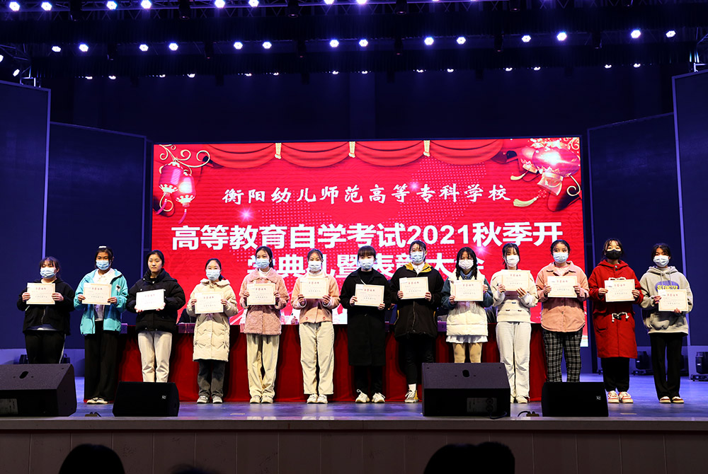 12月16日下午,衡阳幼儿师范高等专科学校在艺术馆召开高等教育自学考试2021年秋季开学典礼暨表彰大会。怀化学院继续教育学院院长周文,校长萧烽,校领导杨安季出席大会,2020级自考老生代表、2021级自考新生代表、耒阳学院学生代表、常宁助学点学生代表参会。大会由继续教育学院负责人刘智主持。
