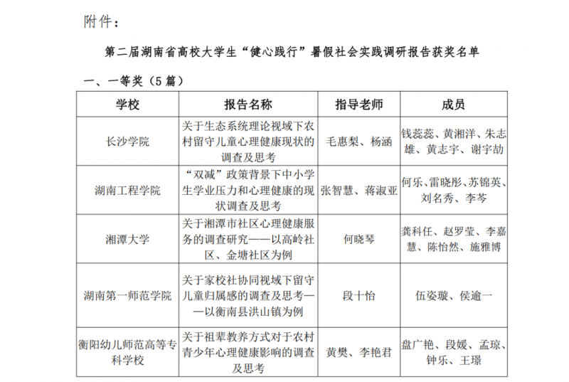 本次活动旨在进一步发挥社会实践在改进大学生思想政治教育中的重要作用,促进湖南省各高校学生主动参与社会心理服务体系建设,激发大学生的社会责任感与时代使命感。评奖根据《第二届湖南省高校大学生“健心践行”暑假社会实践调研的通知》(湘高心研会[2023]11 号)开展,经各个高校选拔、专家评审,最终评选出了5篇一等奖,10 篇二等奖,20 篇三等奖。
