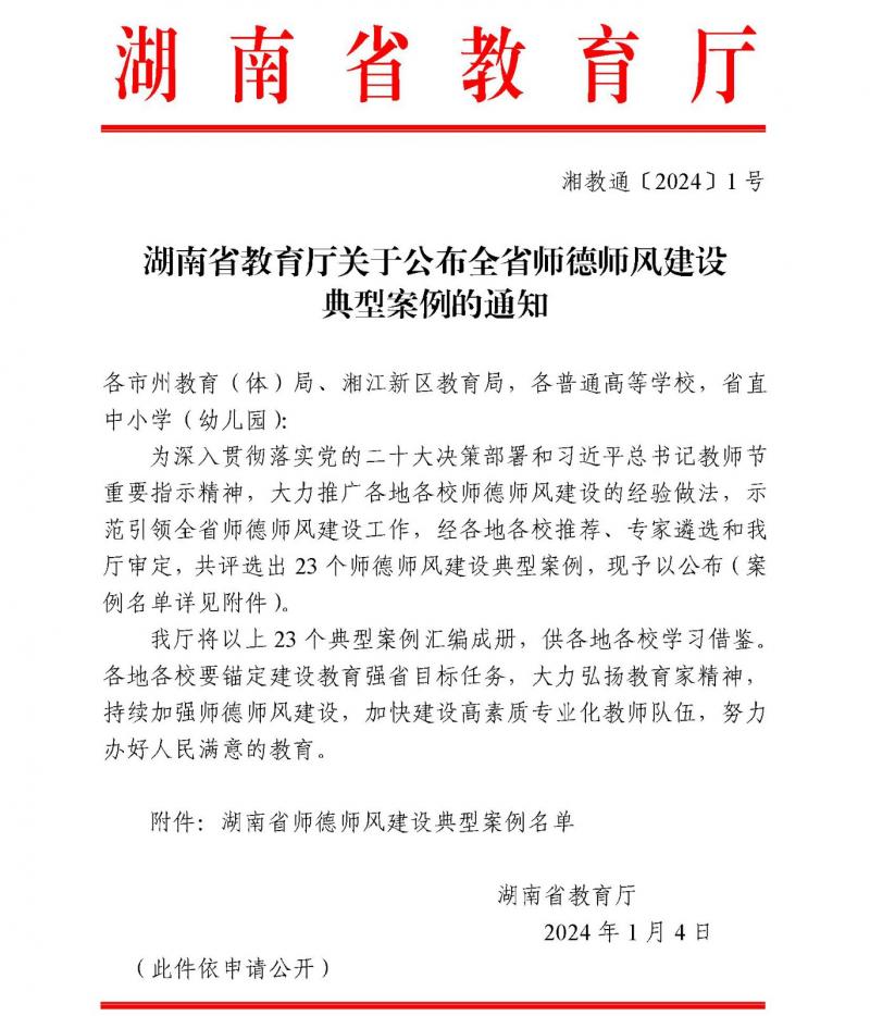 2024年1月4日,湖南省教育厅公布了《湖南省教育厅关于公布全省师德师风建设典型案例的通知》(湘教通〔2024〕1 号),我校报送的《教学相长,师生共建“师德成长共同体”》成功入选。此次师德师风建设典型案例评选工作是由湖南省教育厅面向全省教育系统征集,经各地各校推荐、专家遴选和省教育厅审定,共评选出23个师德师风建设典型案例。其中包含6个教育行政机构、10所中小学、4所本科高校、3所高职高专院校。
