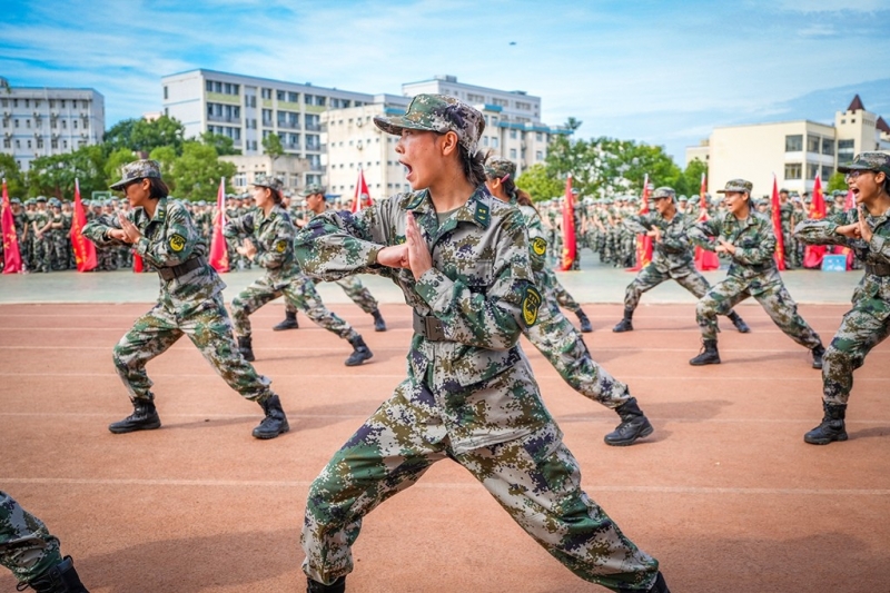 紧接着,承训教官们带来精彩的战术、队列、军体拳、刺杀操表演,展现军人风采,为同学们树立标杆,赢得热烈掌声。