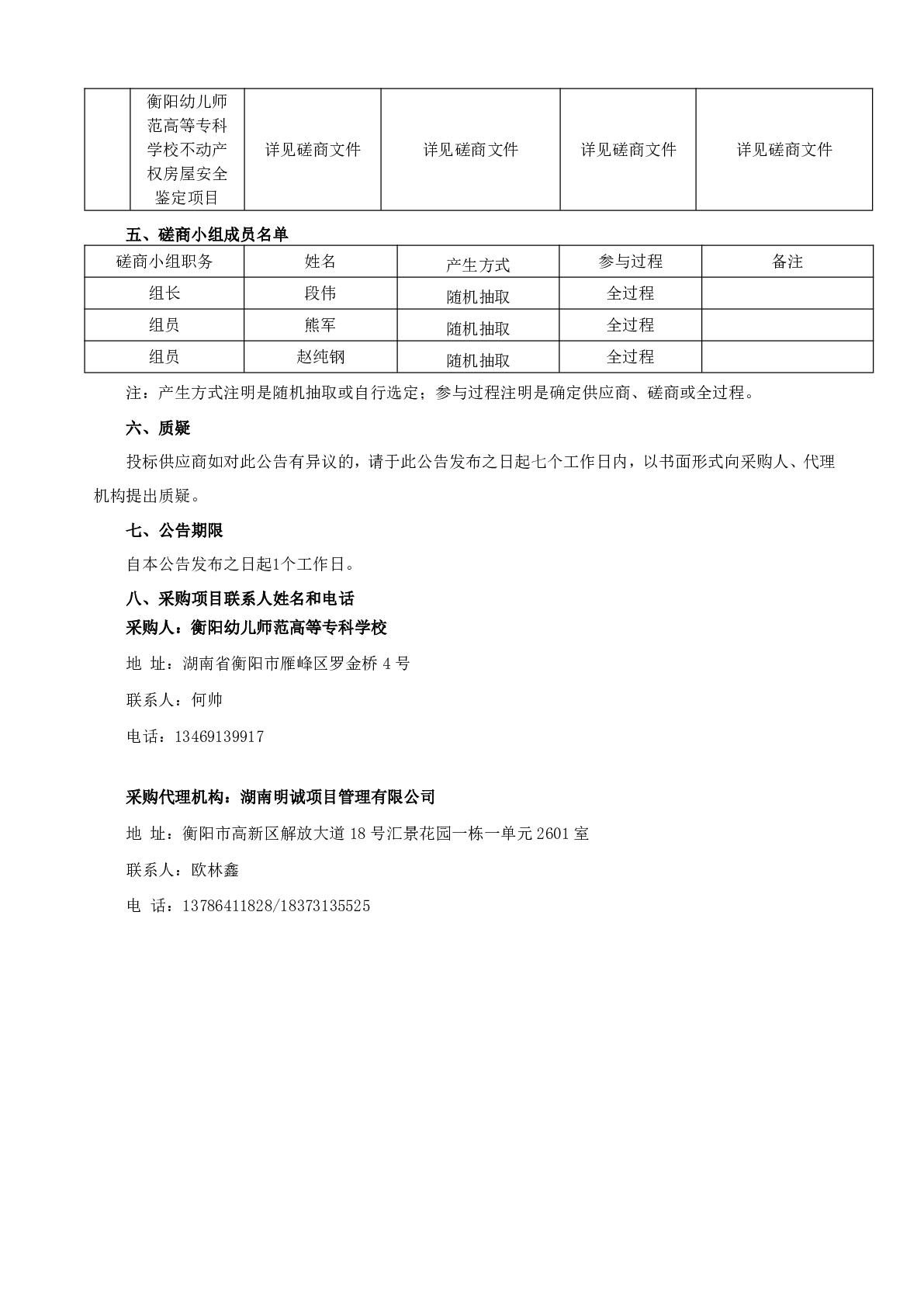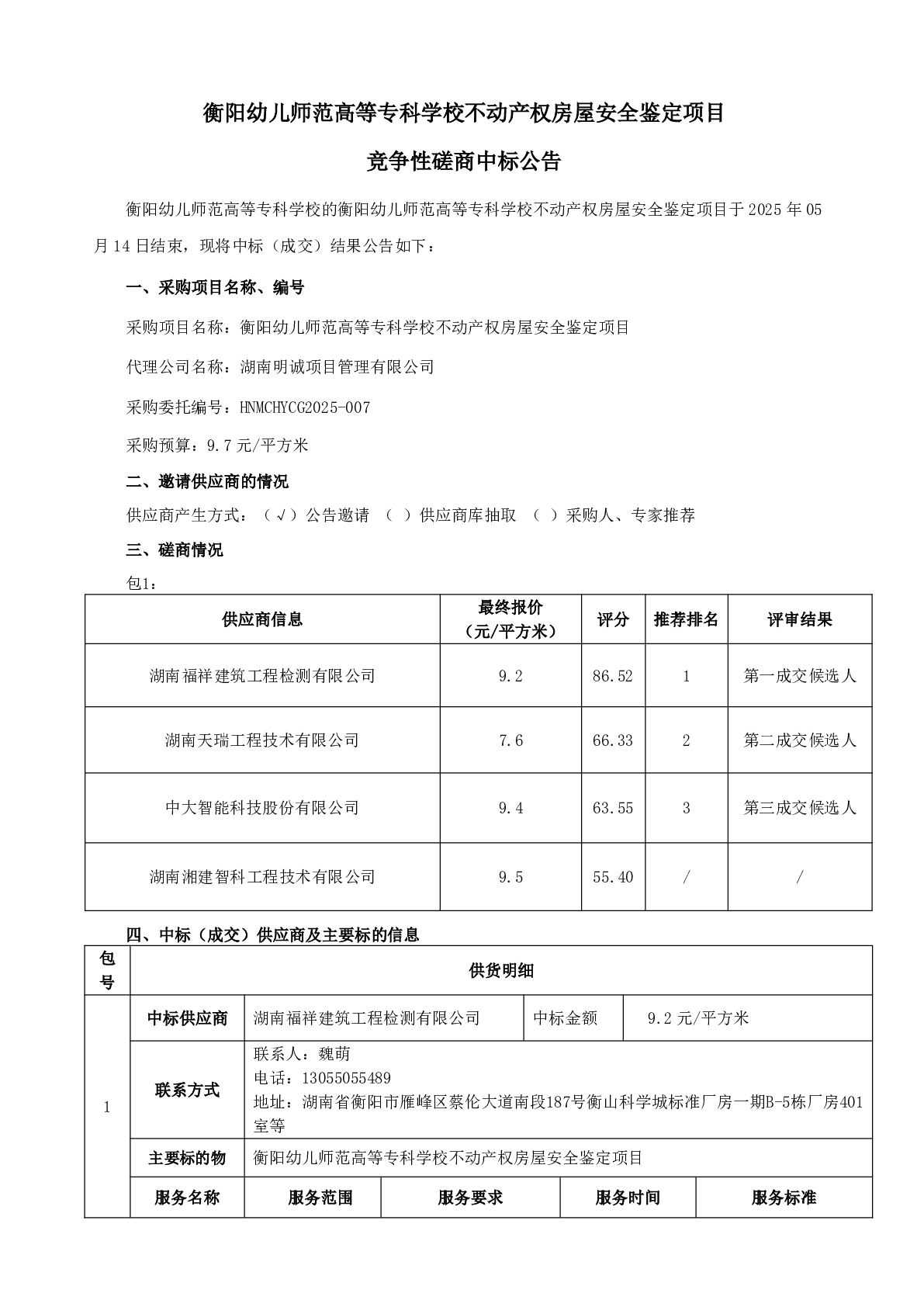 衡阳幼儿师范高等专科学校不动产权房屋安全鉴定项目竞争性磋商中标公告