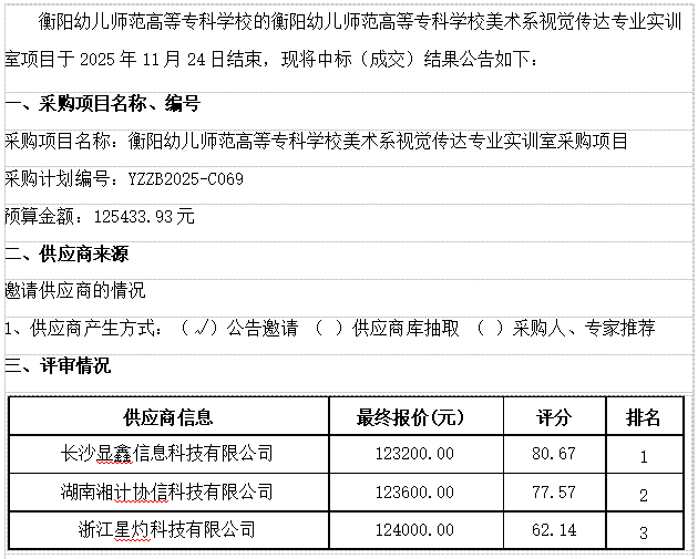 衡阳幼儿师范高等专科学校美术系视觉传达专业实训室项目成交公告