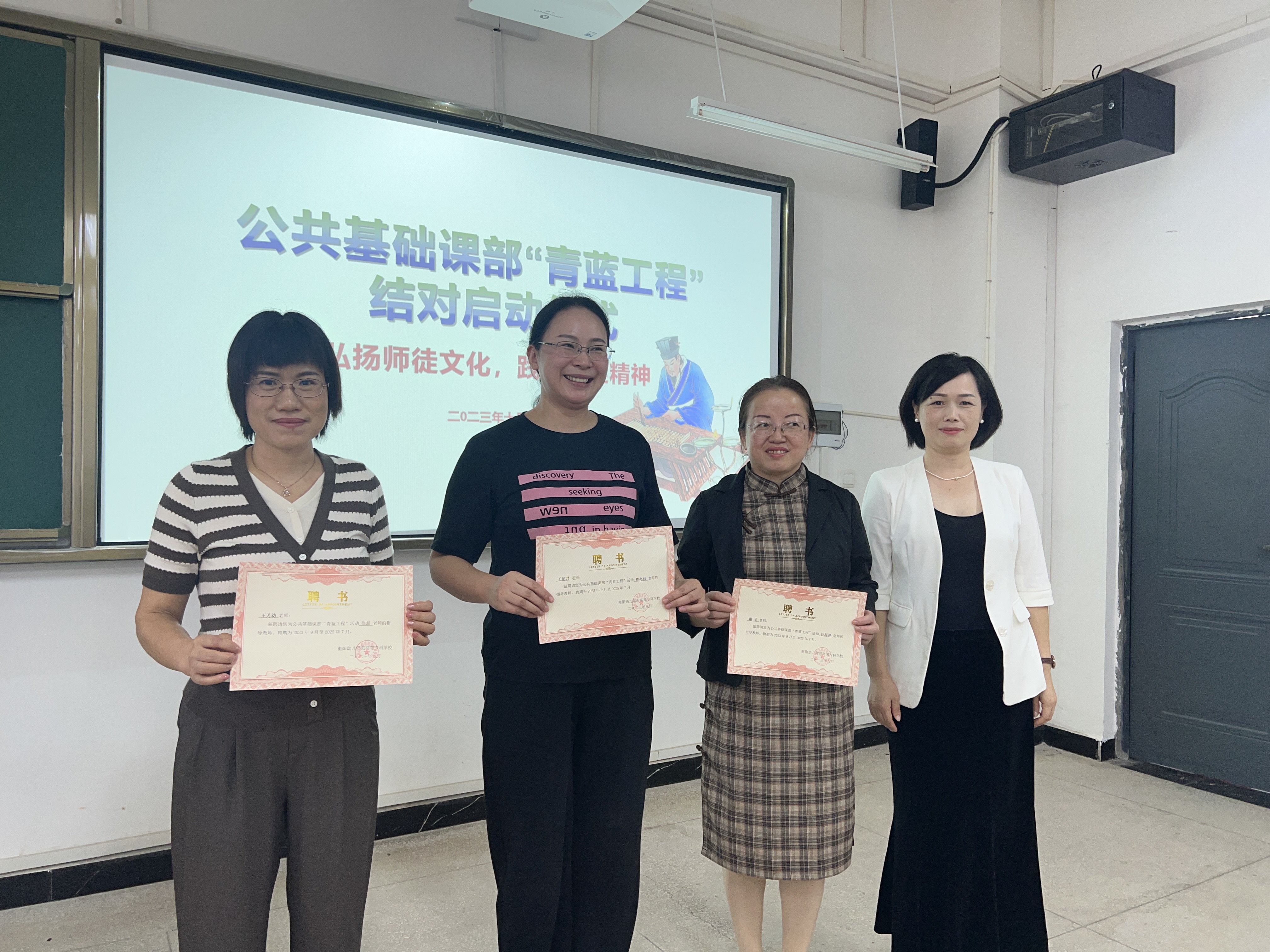 会上,由教务秘书罗玉红老师宣读师徒结对文件。公共基础课部副主任刘梅香为指导教师颁发聘书。