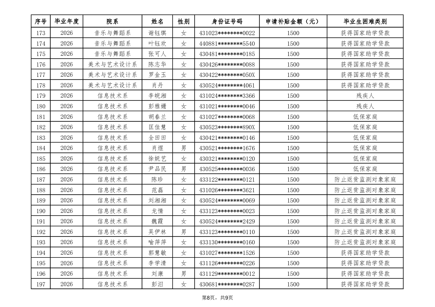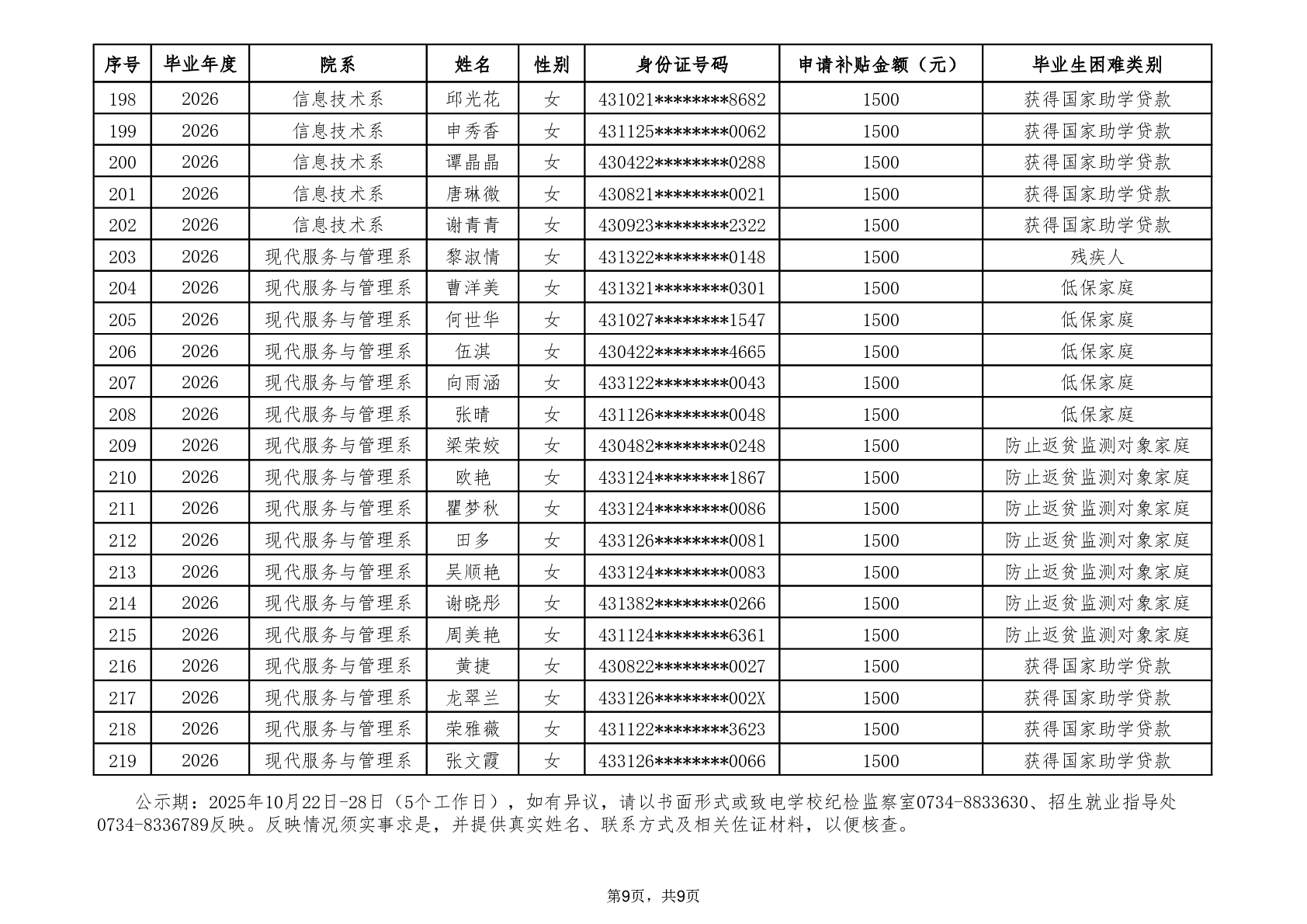 根据湖南省人力资源和社会保障厅等部门《关于做好高校毕业生一次性求职补贴发放工作的通知》(湘人社函〔2025〕59 号)文件精神,我校严格按照 “个人申请 — 系部初审 — 学校审核 — 人社部门审定” 的流程,对 2026 届毕业生一次性求职创业补贴申请进行了全面审核。现将审核通过的219名毕业生名单(详见附件)予以公示。公示期:2025年10月22日-28日(5个工作日),如有异议,请以书面形式或致电学校纪检监察室0734-8833630、招生就业指导处0734-8336789反映。反映情况须实事求是,并提供真实姓名、联系方式及相关佐证材料,以便核查。