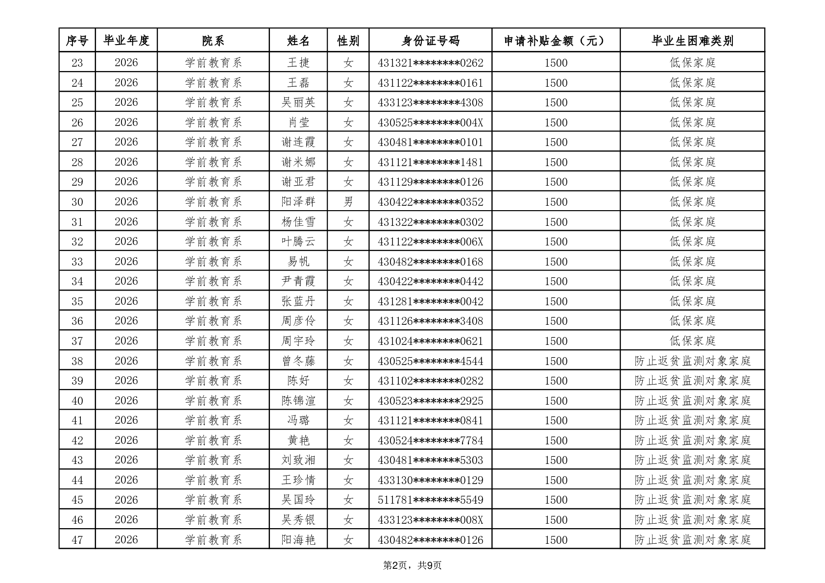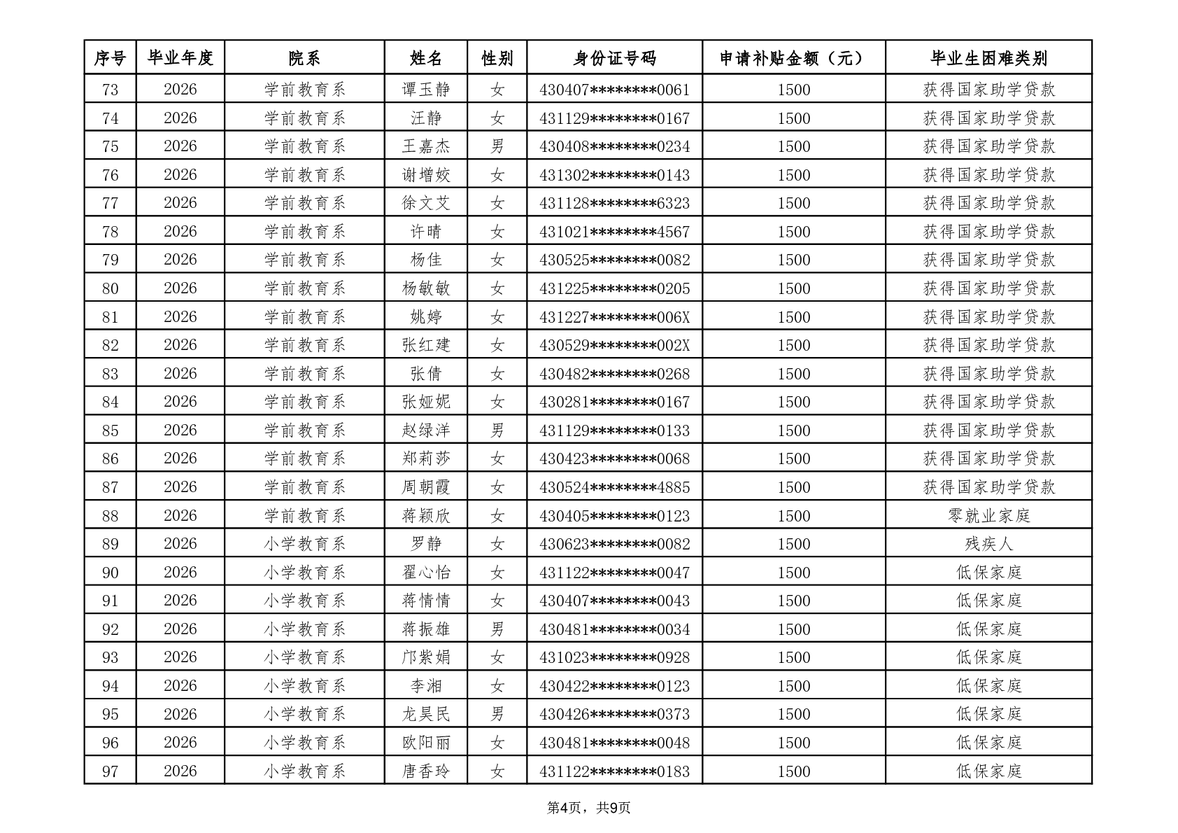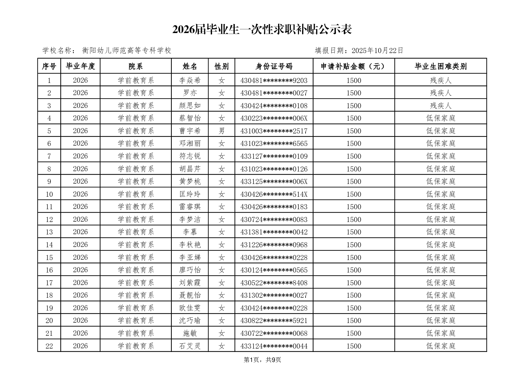 关于衡阳幼儿师范高等专科学校 2026 届毕业生一次性求职创业补贴审核通过名单的公示