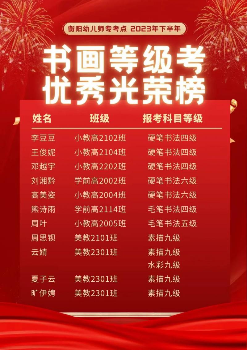 2023年下半年书画等级考衡阳幼师考点通过名单