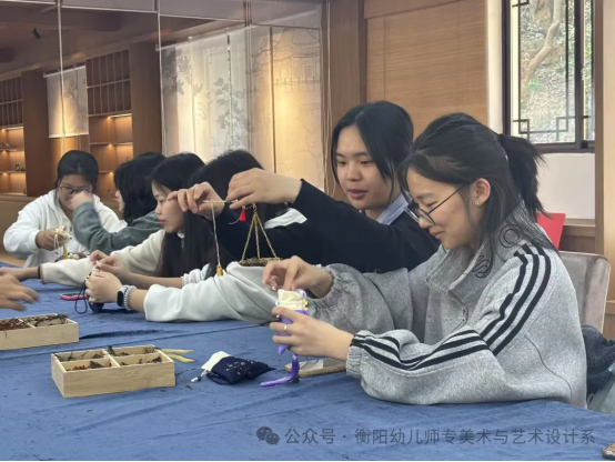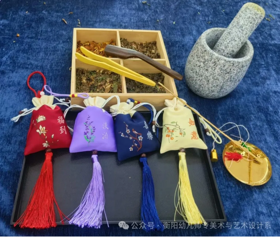 随后,我们将研磨好的药粉小心翼翼地装入小巧精致的香囊袋中。一针一线穿梭其间,将满满的祝福与关怀紧紧缝进香囊。据说,这些凝聚着我们心血的香囊,不仅能散发迷人的香气,还具有防疫病的功效。当一个个饱含心意的香囊在手中诞生,我们仿佛也接过了传承千年的健康守护接力棒。