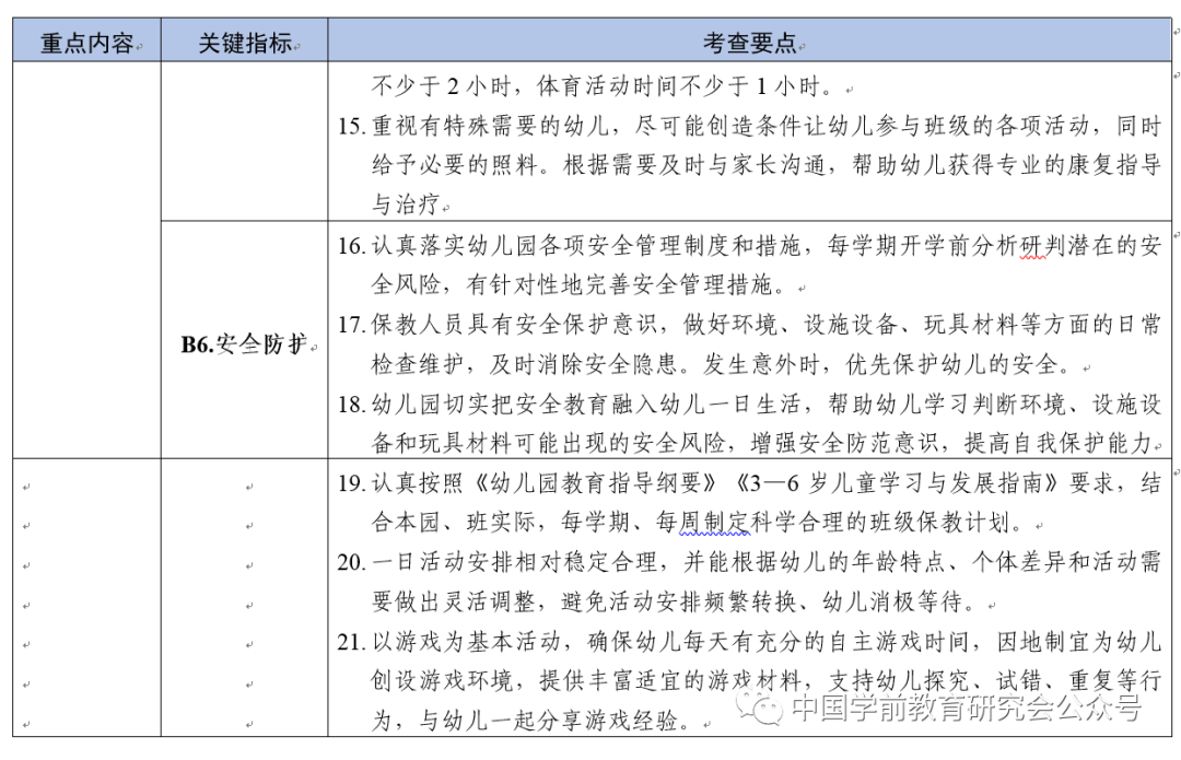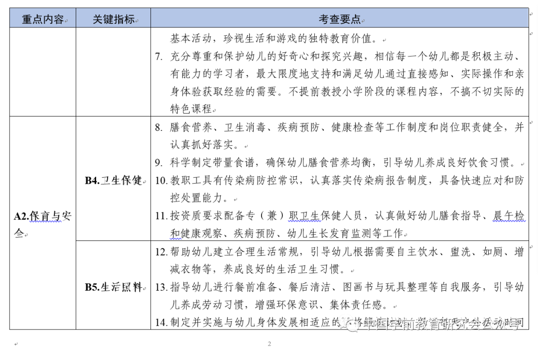 (二)保育与安全。包括卫生保健、生活照料、安全防护等3项关键指标,旨在促进幼儿园加强膳食营养、疾病预防、健康检查等工作,建立合理的生活常规,强化医护保健人员配备、安全保障和制度落实,确保幼儿生命安全和身心健康。