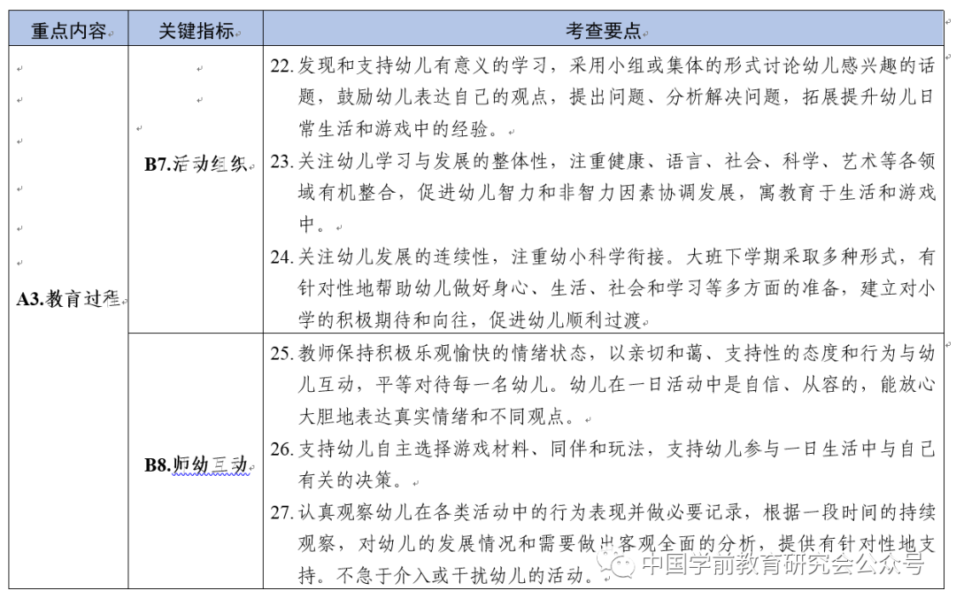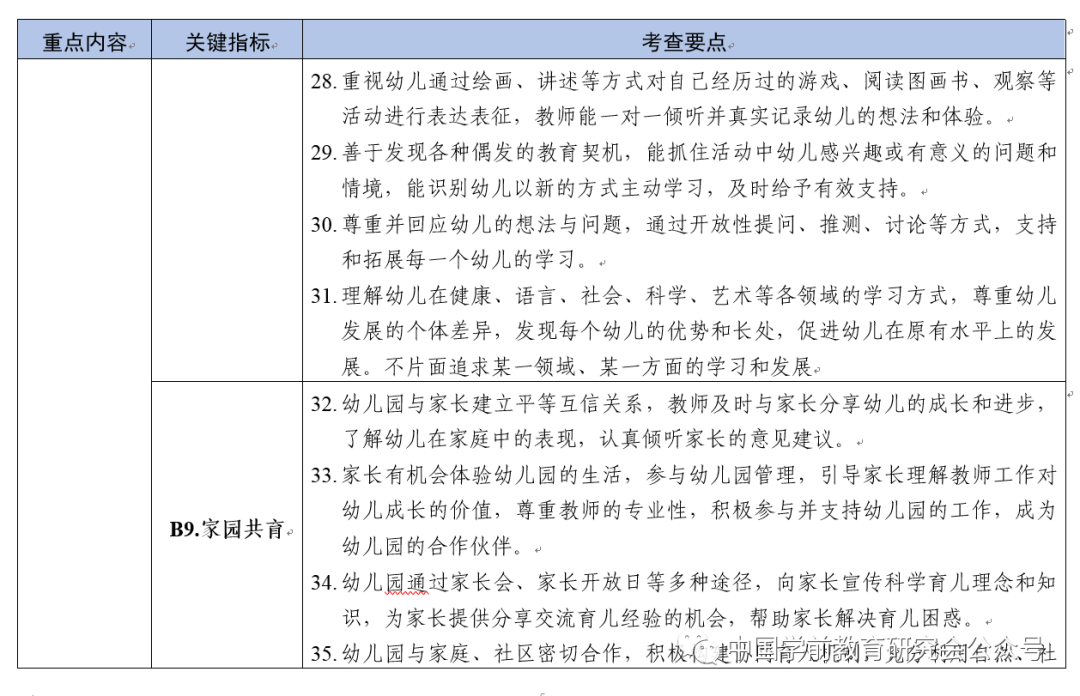 (一)注重过程评估。重点关注保育教育过程质量,关注幼儿园提升保教水平的努力程度和改进过程,严禁用直接测查幼儿能力和发展水平的方式评估幼儿园保育教育质量。