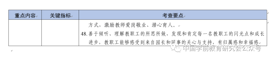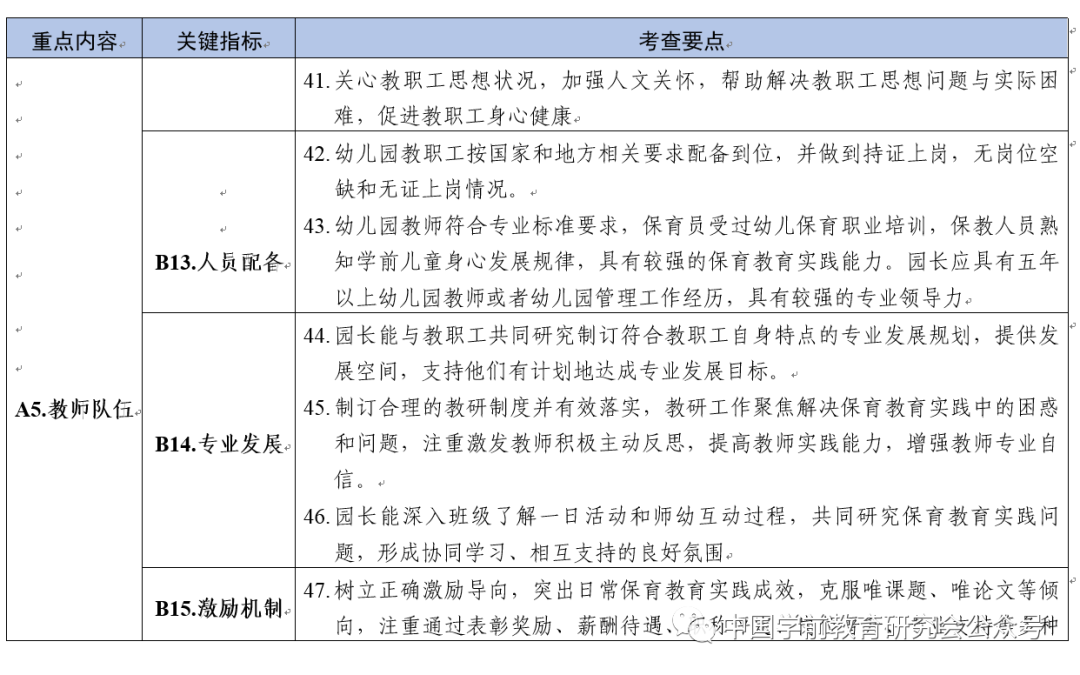 (五)教师队伍。包括师德师风、人员配备、专业发展和激励机制等4项关键指标,旨在促进幼儿园加强教师师德工作,注重教师专业能力建设,提高园长专业领导力,采取有效措施激励教师爱岗敬业、潜心育人。