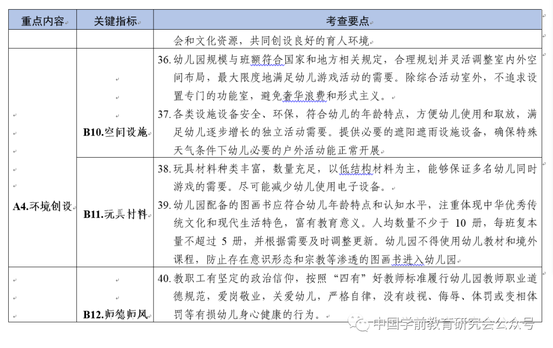 (四)环境创设。包括空间设施、玩具材料等2项关键指标,旨在促进幼儿园积极创设丰富适宜、富有童趣、有利于支持幼儿学习探索的教育环境,配备数量充足、种类多样的玩教具和图画书,有效支持保育教育工作科学实施。