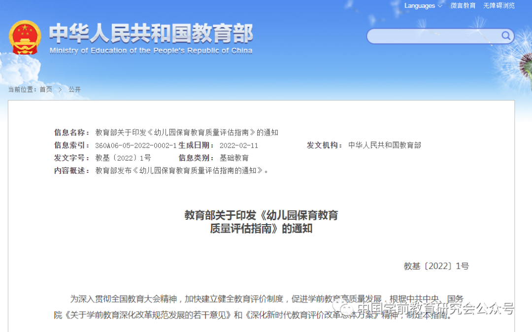 教育部关于印发《幼儿园保育教育质量评估指南》的通知