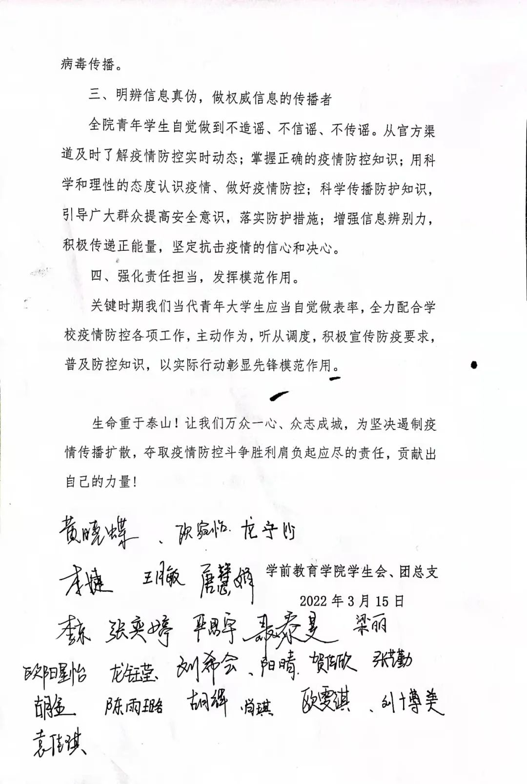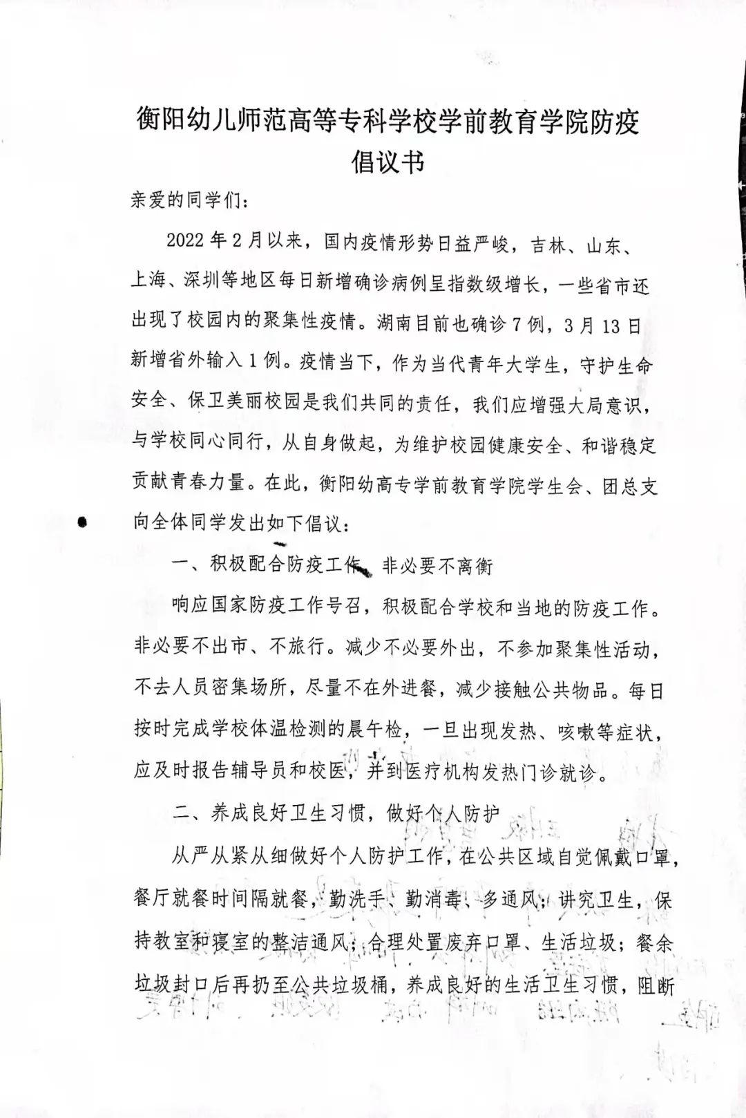 2022年2月以来,国内疫情形势日益严峻,吉林、山东、上海、深圳等地区每日新增确诊病例呈指数级增长,一些省市还出现了校园内的聚集性疫情。湖南目前也确诊7例,3月13日新增省外输入1例。疫情当下,作为当代青年大学生,守护生命安全、保卫美丽校园是我们共同的责任,我们应增强大局意识,与学校同心同行,从自身做起,为维护校园健康安全、和谐稳定贡献青春力量。在此,衡阳幼高专学前教育学院学生会、团总支向全体同学发出如下倡议: 一、积极配合防疫工作,非必要不离衡 响应国家防疫工作号召,积极配合学校和当地的防疫工作。非必要不出市、不旅行。减少不必要外出,不参加聚集性活动,不去人员密集场所,尽量不在外进餐,减少接触公共物品。每日按时完成学校体温检测的晨午检,一旦出现发热、咳嗽等症状,应及时报告辅导员和校医,并到医疗机构发热门诊就诊。 二、养成良好卫生习惯,做好个人防护 从严从紧从细做好个人防护工作,在公共区域自觉佩戴口罩,餐厅就餐时间隔就餐,勤洗手、勤消毒、多通风;讲究卫生,保持教室和寝室的整洁通风;合理处置废弃口罩、生活垃圾;餐余垃圾封口后再扔至公共垃圾桶,养成良好的生活卫生习惯,阻断病毒传播。 三、明辨信息真伪,做权威信息的传播者 全院青年学生自觉做到不造谣、不信谣、不传谣。从官方渠道及时了解疫情防控实时动态;掌握正确的疫情防控知识;用科学和理性的态度认识疫情、做好疫情防控;科学传播防护知识,引导广大群众提高安全意识,落实防护措施;增强信息辨别力,积极传递正能量,坚定抗击疫情的信心和决心。 四、强化责任担当,发挥模范作用。 关键时期我们当代青年大学生应当自觉做表率,全力配合学校疫情防控各项工作,主动作为,听从调度,积极宣传防疫要求,普及防控知识,以实际行动彰显先锋模范作用。 生命重于泰山!让我们万众一心、众志成城,为坚决遏制疫情传播扩散,夺取疫情防控斗争胜利肩负起应尽的责任,贡献出自己的力量! 编辑?| 刘姣 文稿 |?学生会 团总支 图片|团总支宣传部 责任编辑?| 陈琴 严思宇 一审 | 吴迪 终审 | 刘东航