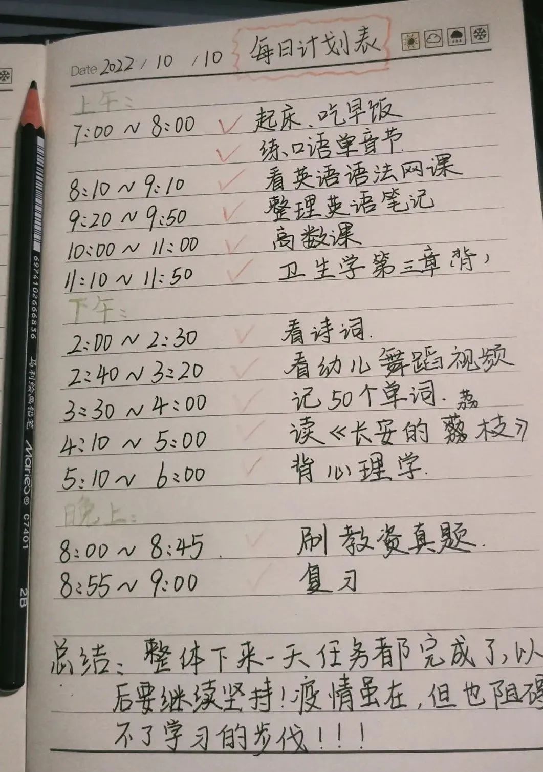 刚开始隔离的一两天,我内心是极为恐惧的,不安和焦虑的情绪也在心中慢慢发酵,但是老师的问候、同学的关怀、医护人员的照顾……这一切的一切都让我感受到我们从来都不是孤身一人。慢慢地,我没有了恐慌,没有了急躁,开始积极面对生活。因为隔离期间可以自由支配时间有很多,所以我制定了一份详细的计划表,尽可能利用起每一分钟,还会通过网络自学课程,遇到不懂的问题主动询问老师,也终于抽出时间去看了自己想看很久却一直没去看的小说。我始终相信疫情终将过去,阳光终会再次照耀大地!