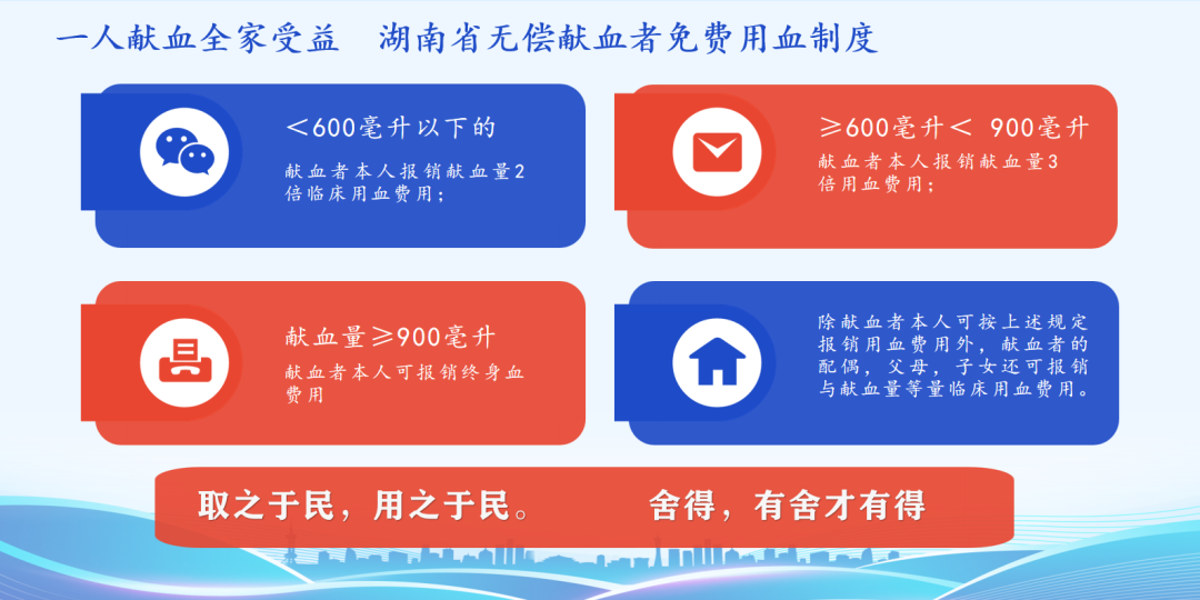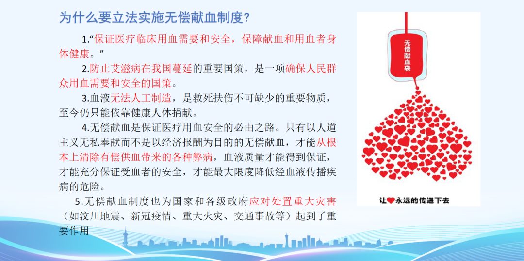 无偿献血是终身的荣誉,献血者也会受到社会的尊重和爱戴,是一份造福社会的公益事业。捐献一份血液,奉献一份爱心,让我们用青春的热血,筑起生命的长桥!