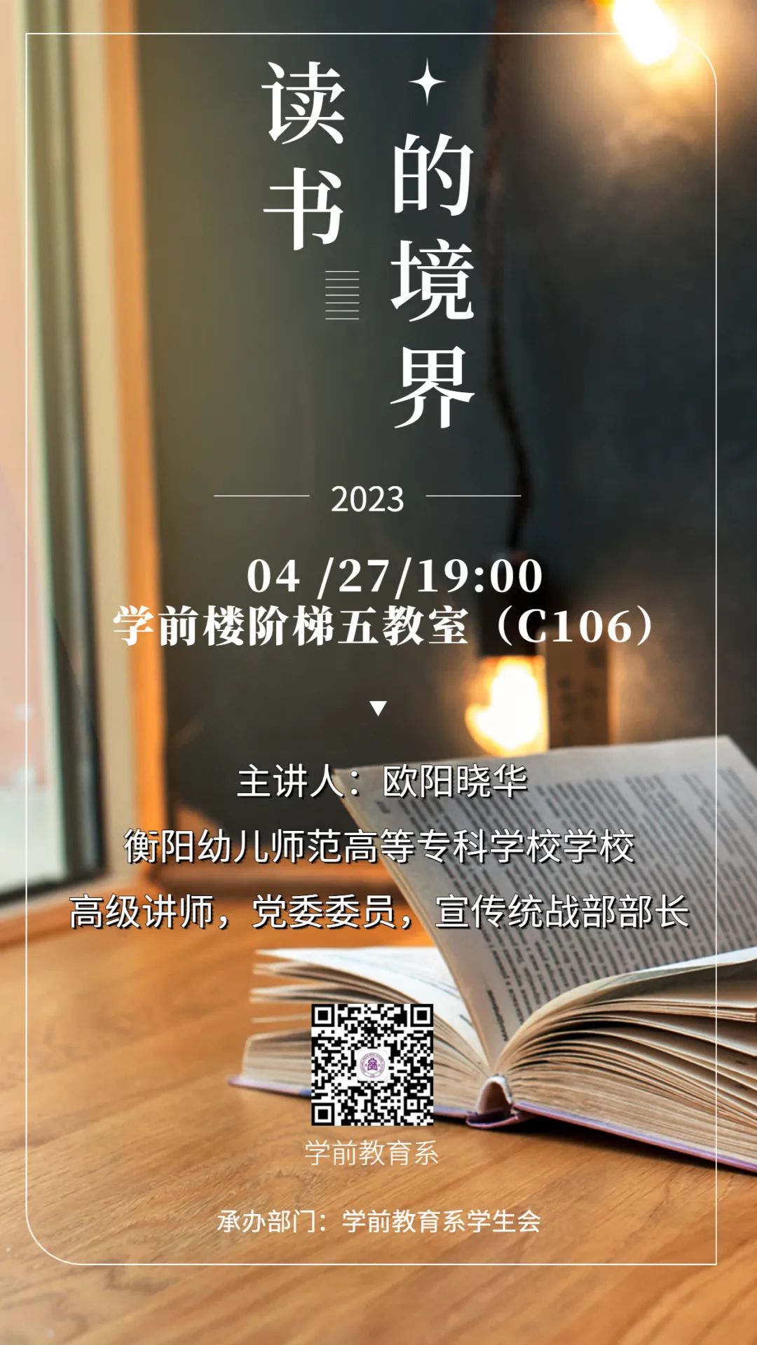 为传承楚怡职教精神,推动形成爱读书、读好书、善读书的浓厚氛围。学前教育系特举办“读书的境界”主题讲座,邀请衡阳幼儿师范高等专科学校高级讲师,党委委员,宣传统战部部长欧阳晓华担任本次讲座主讲人,带领同学们领略读书的各种不同境界,期待同学们的参加。