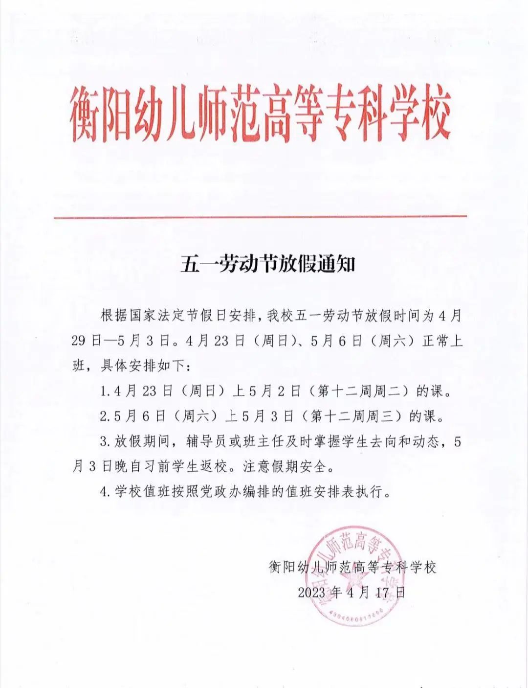 根据国家法定节假日安排和学校五一劳动节放假通知,为加强放假期间学生安全教育和管理,现将有关事项通知如下: