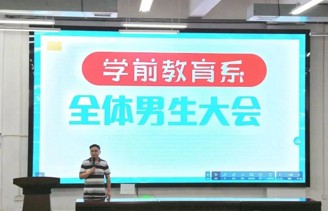 为充分调动男生的学习行为,树立正确的专业认知观,激发男生的责任担当与安全意识。学前教育系于6月7日中午12:30在C105召开了系部男生大会。学前教育系专职副书记马奕斌同志、学生管理干事吴鹏老师和辅导员李聪老师出席会议。