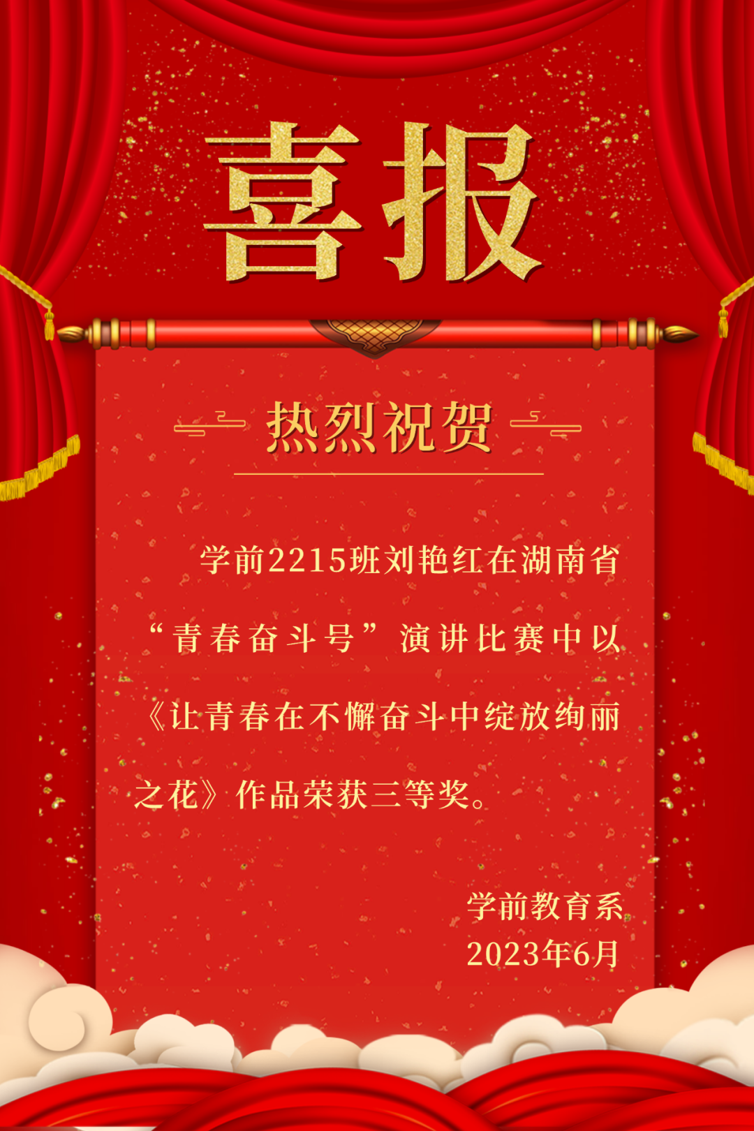 青春逢盛世,奋斗正当时。为全面贯彻落实习近平总书记关于青年工作重要讲话精神,积极响应湖南省教育工委有关“奋斗青春号”主题系列活动,学前2215班刘艳红在湖南省“青春奋斗号”演讲比赛中以《让青春在不懈奋斗中绽放绚丽之花》作品荣获三等奖。