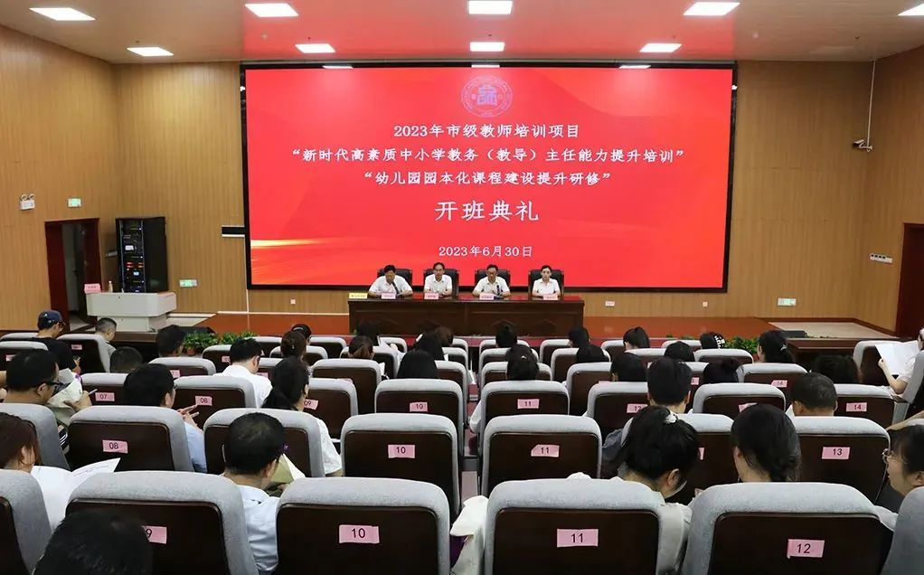 6月30日上午,衡阳市2023年市级教师培训项目“新时代高素质中小学教务(教导)主任能力提升培训”和“幼儿园园本化课程建设提升研修班”在衡阳幼儿师范高等专科学校举行开班仪式,来自市直幼儿园的105名骨干教师和中小学的83名教务(教导)主任即将开始为期三天的学习交流活动。衡阳幼儿师专党委委员、副校长林祥春,党委委员、宣传统战部部长欧阳晓华及学校相关处室、系部负责人出席此次开班仪式。