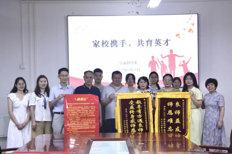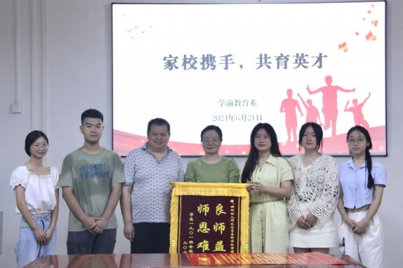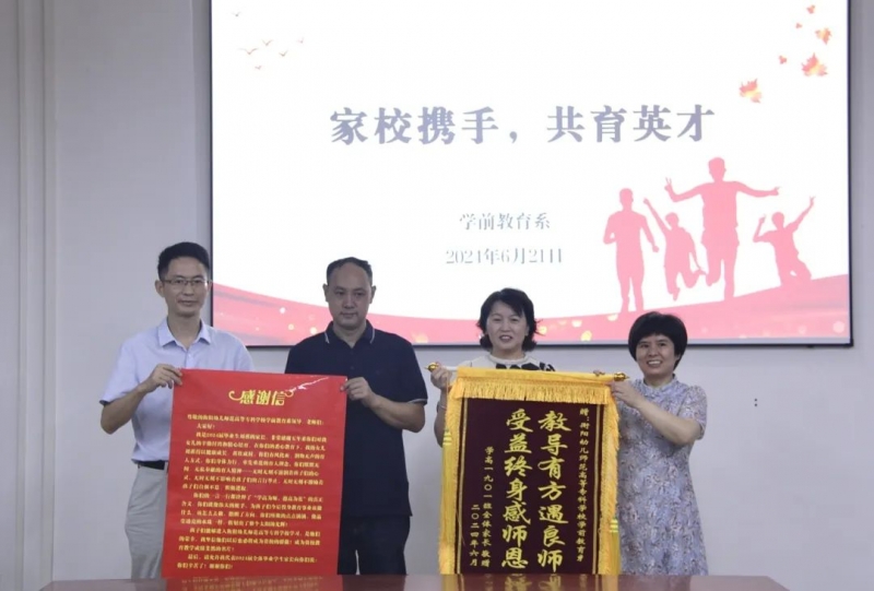 2024年6月21日上午,学前高1901班五年制公费师范生及学生家长向学前教育系送锦旗、谢师恩,学前教育系党总支书记邓艳华、主任杨钰锋、专职副书记马奕斌、副主任石海心、副主任邹文姣、班主任曹文生老师出席现场。