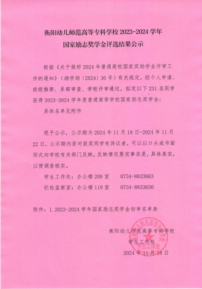 2023-2024学年普通高等学校国家奖学金增额评选结果公示——衡阳幼儿师范高等专科学校...