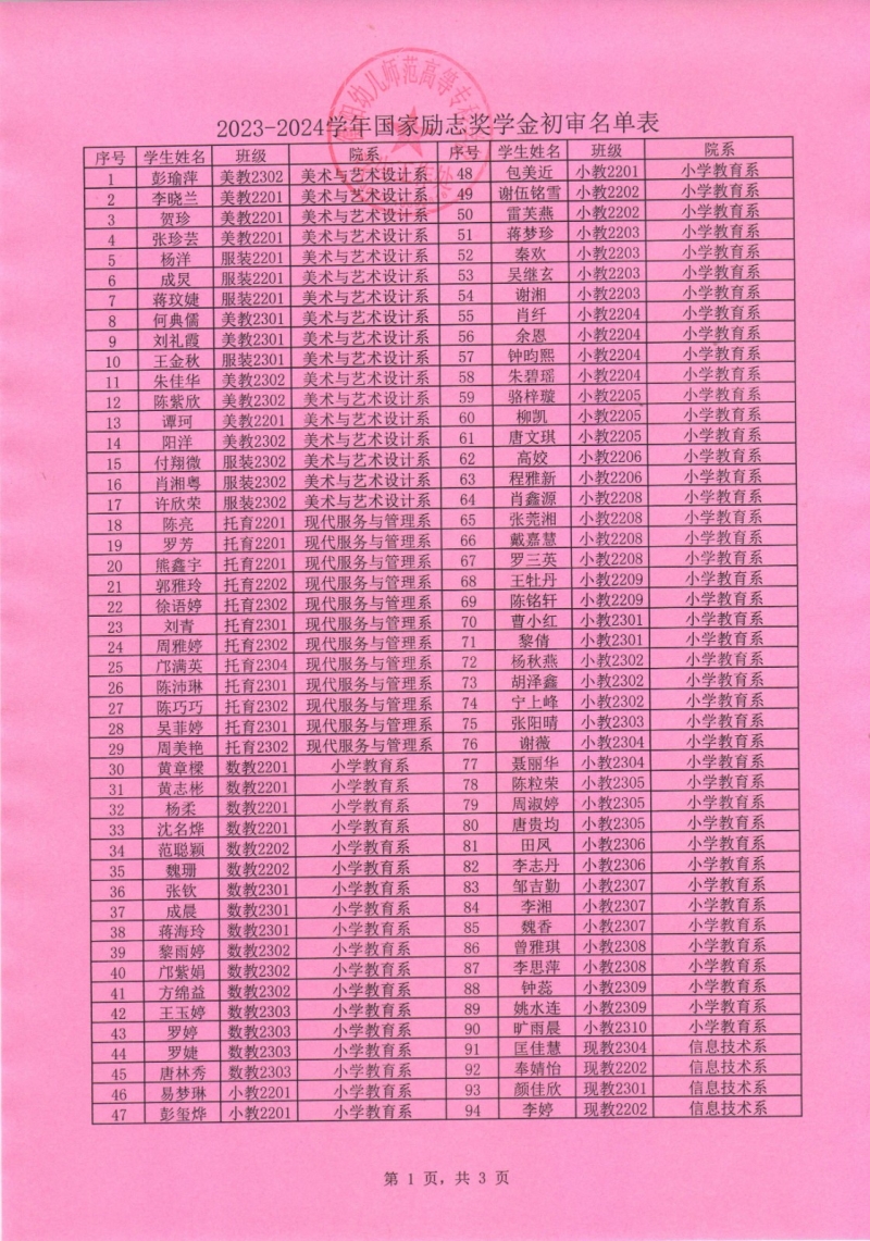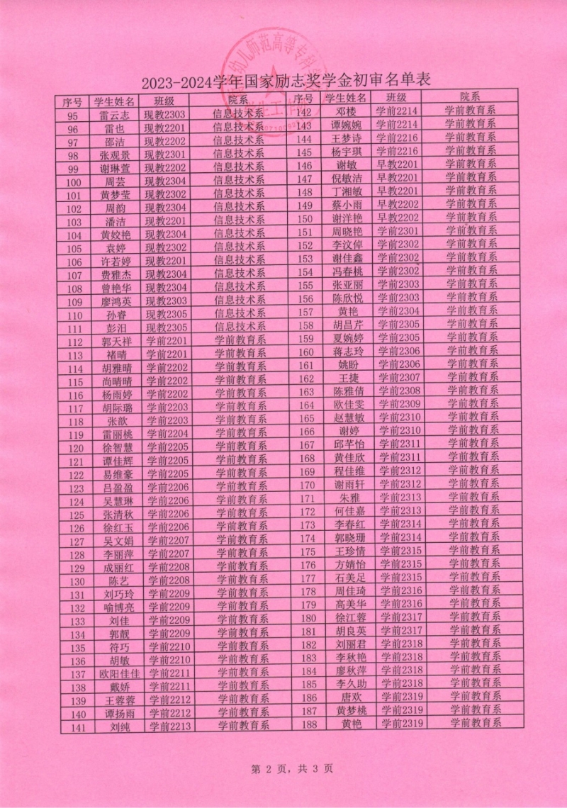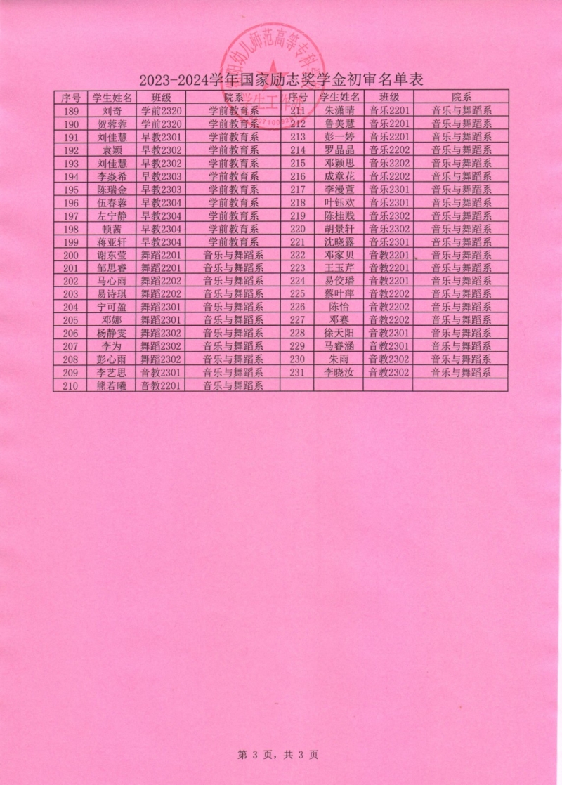 2023-2024学年国家励志奖学金评选结果公示(衡阳幼儿师范高等专科学校)