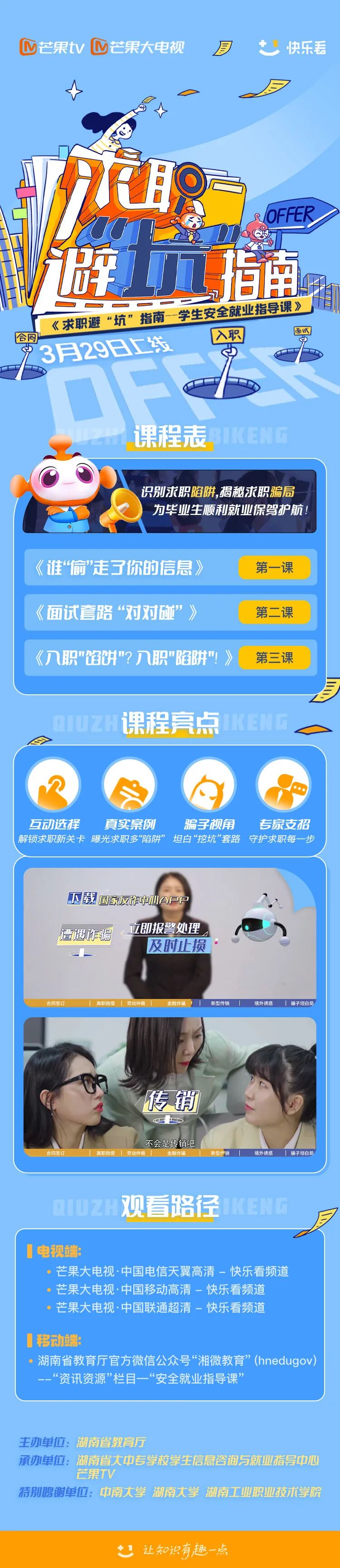 为指导毕业生防范求职就业“陷阱”,帮助毕业生安全就业,湖南省教育厅、湖南省大中专学校学生信息咨询与就业指导中心联合芒果TV精心策划了《求职避“坑”指南——学生安全就业指导课》,通过互动情景剧的节目形式,带领观众一同见招拆招。