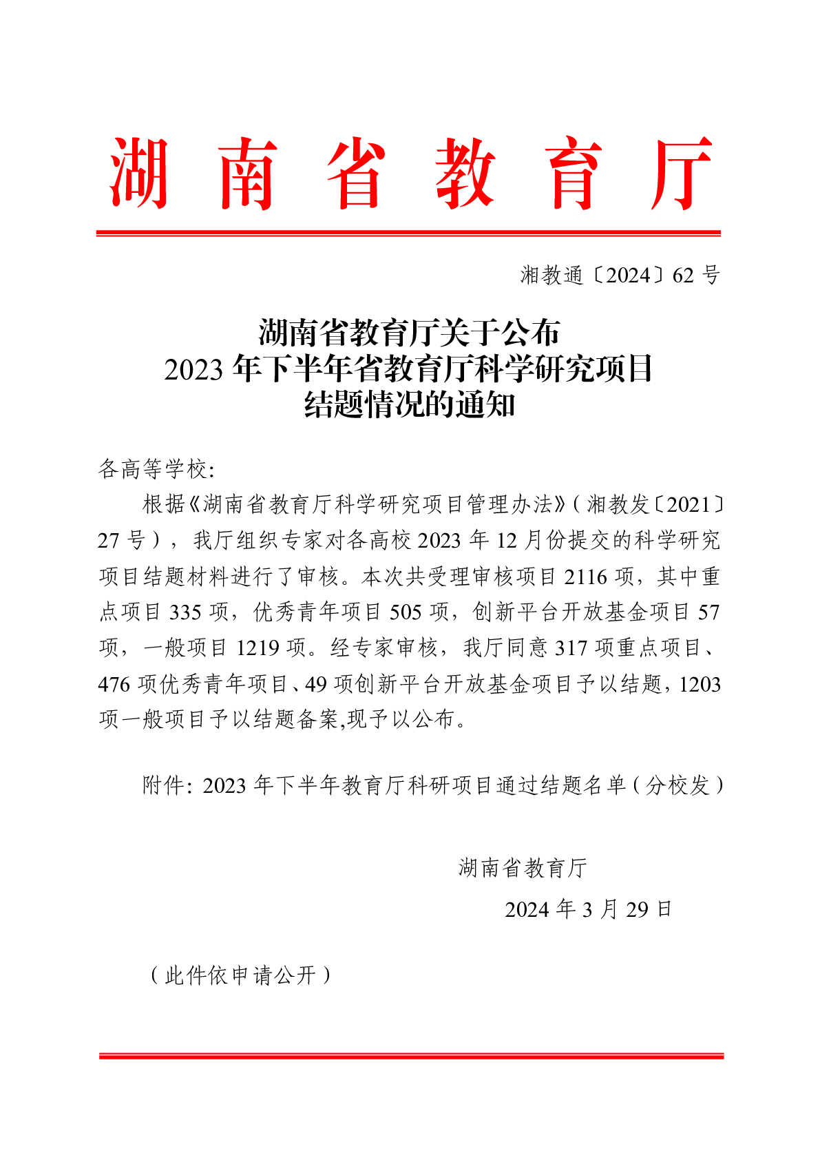 湖南省教育厅关于公布2023年下半年省教育厅科学研究项目结题情况的通知