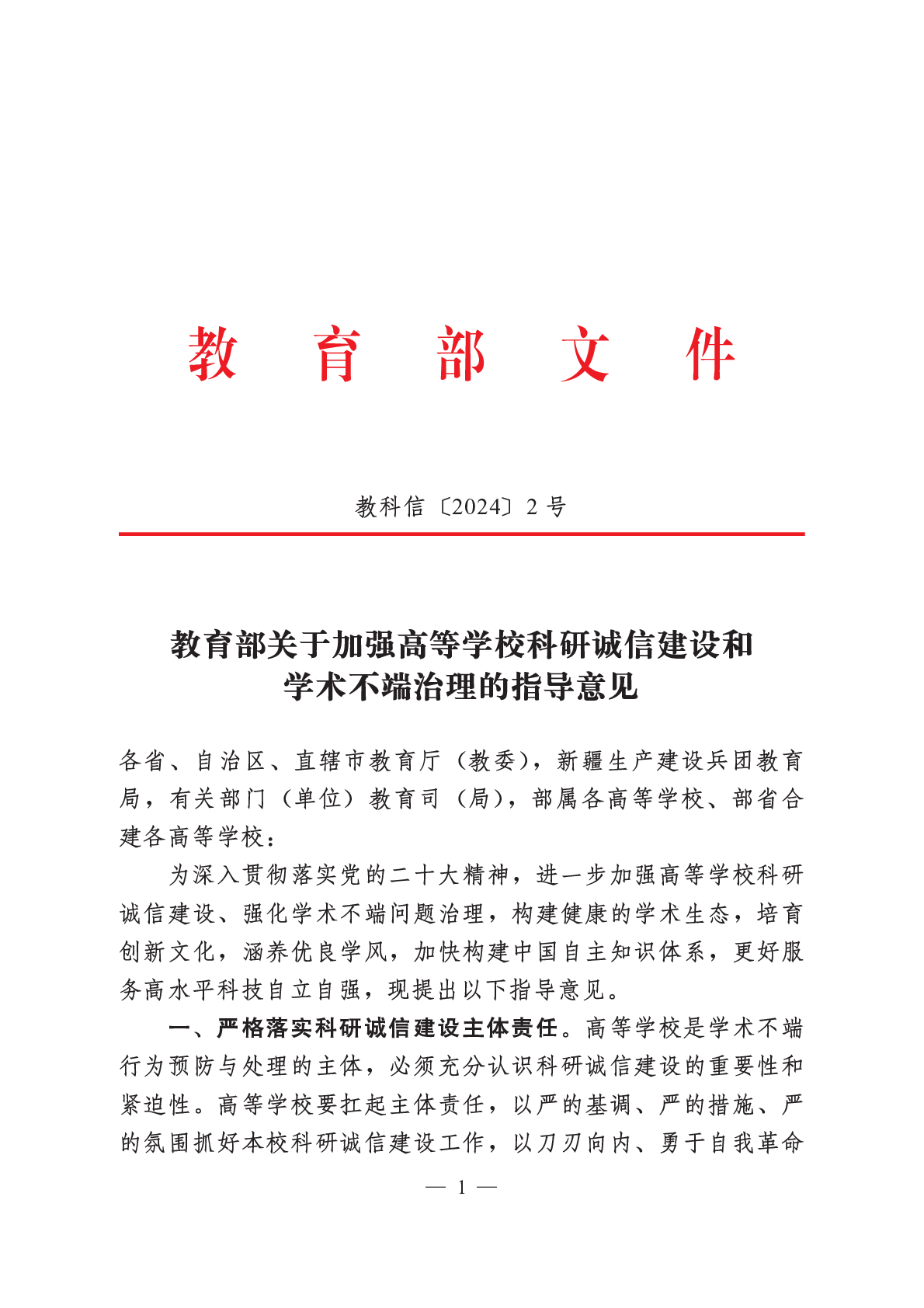教科信〔2024〕2号+教育部关于加强高等学校科研诚信建设和学术不端治理的指导意见