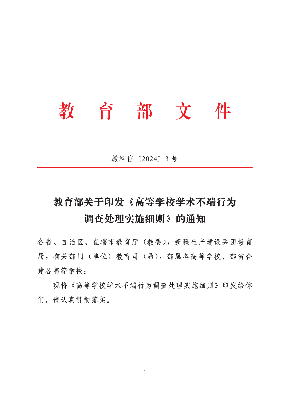 教科信〔2024〕3号+教育部关于印发《高等学校学术不端行为调查处理实施细则》的通知