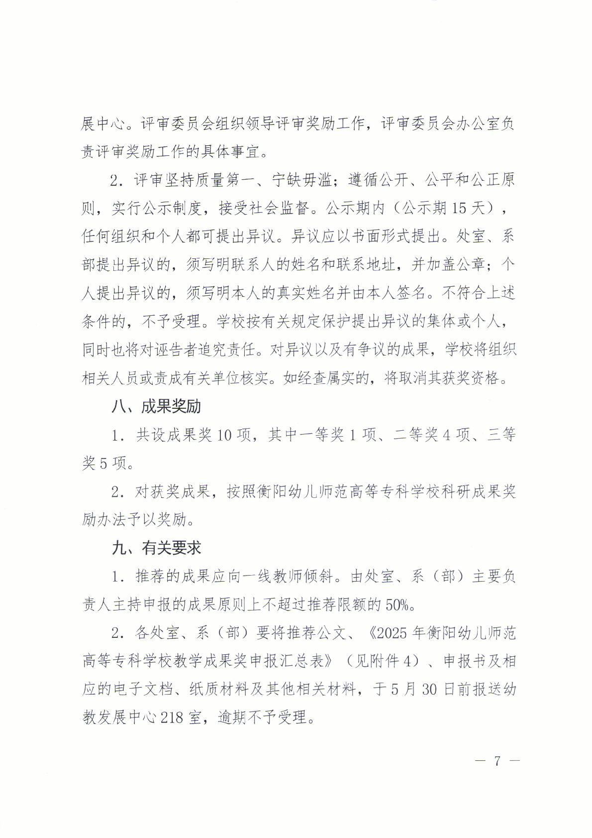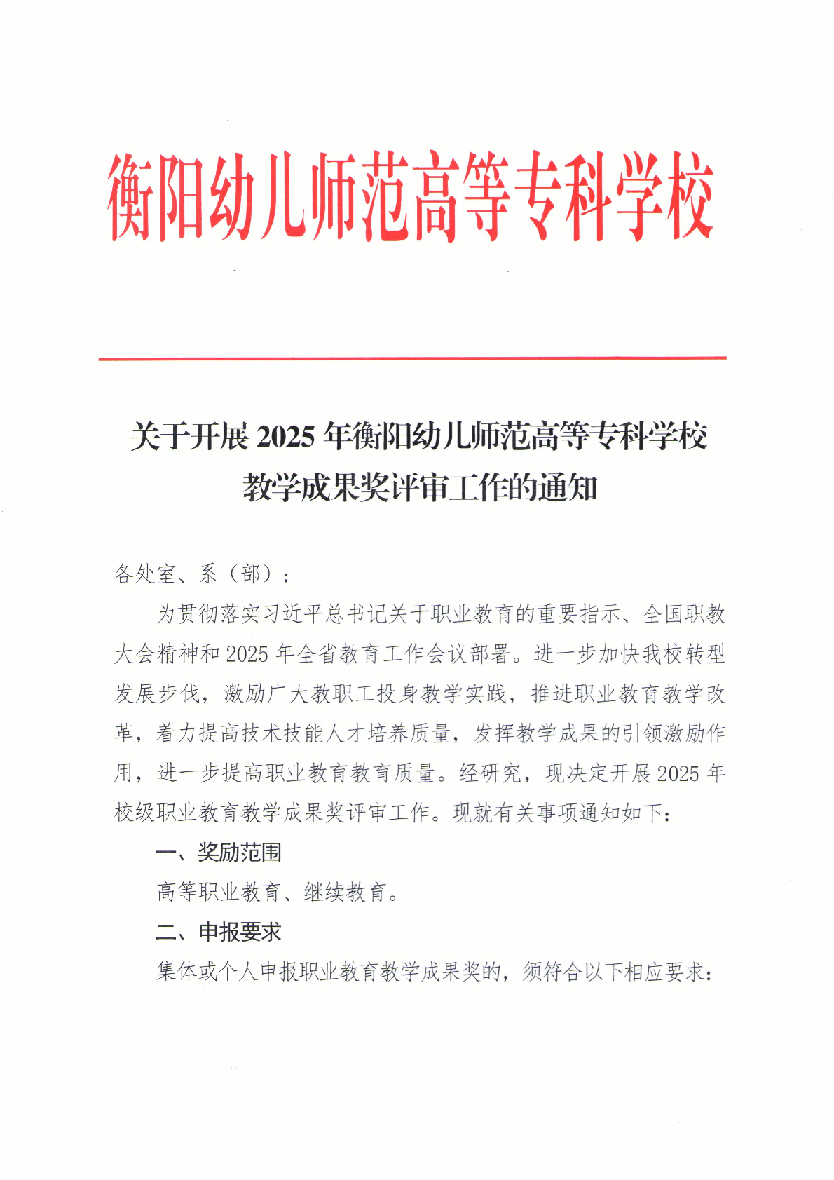 关于开展2025年衡阳幼儿师范高等专科学校教学成果奖评审工作的通知
