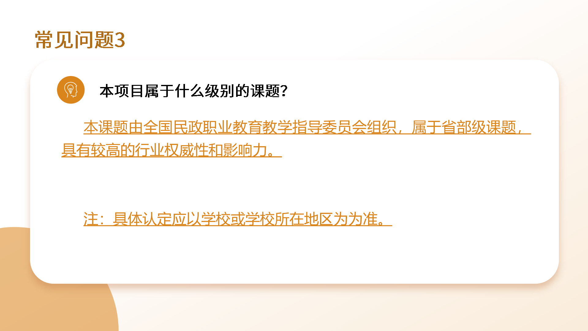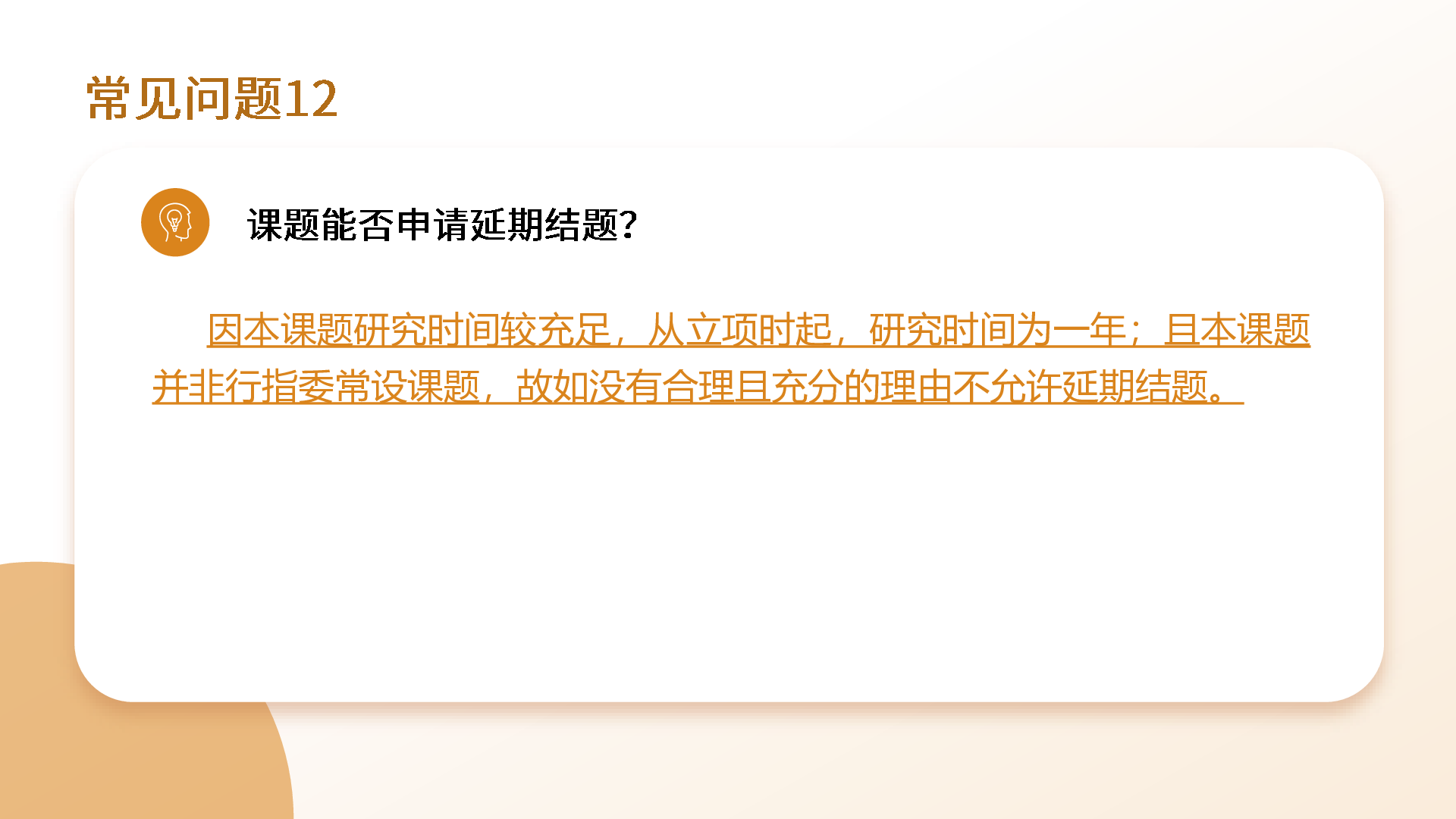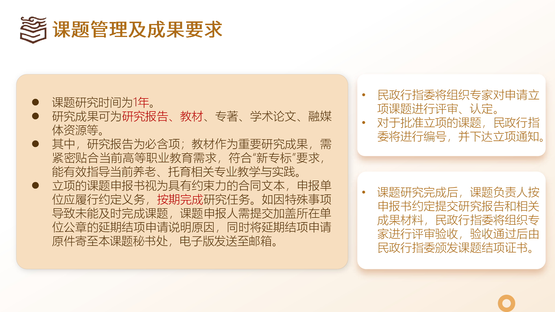 (一)课题研究时间为1年。研究成果可为研究报告、教材、专著、学术论文、融媒体资源等。其中,研究报告为必含项;教材作为重要研究成果,需紧密贴合当前高等职业教育需求,符合“新专标”要求,能有效指导当前养老、托育相关专业教学与实践。立项的课题申报书视为具有约束力的合同文本,申报单位应履行约定义务,按期完成研究任务。如因特殊事项导致未能及时完成课题,课题申报人需提交加盖所在单位公章的延期结项申请说明原因,同时将延期结项申请原件寄至本课题秘书处,电子版发送至邮箱。