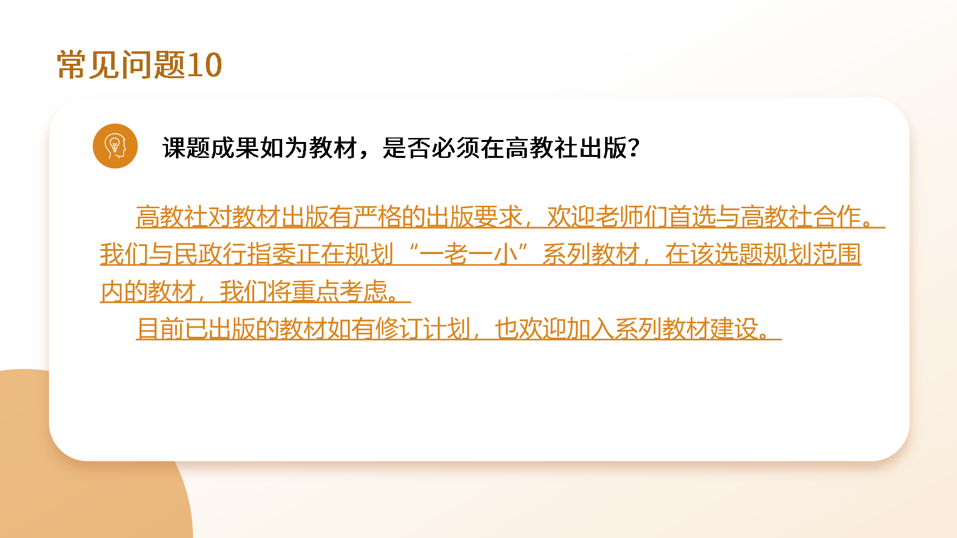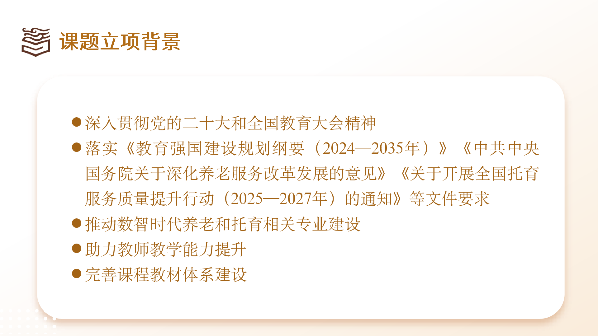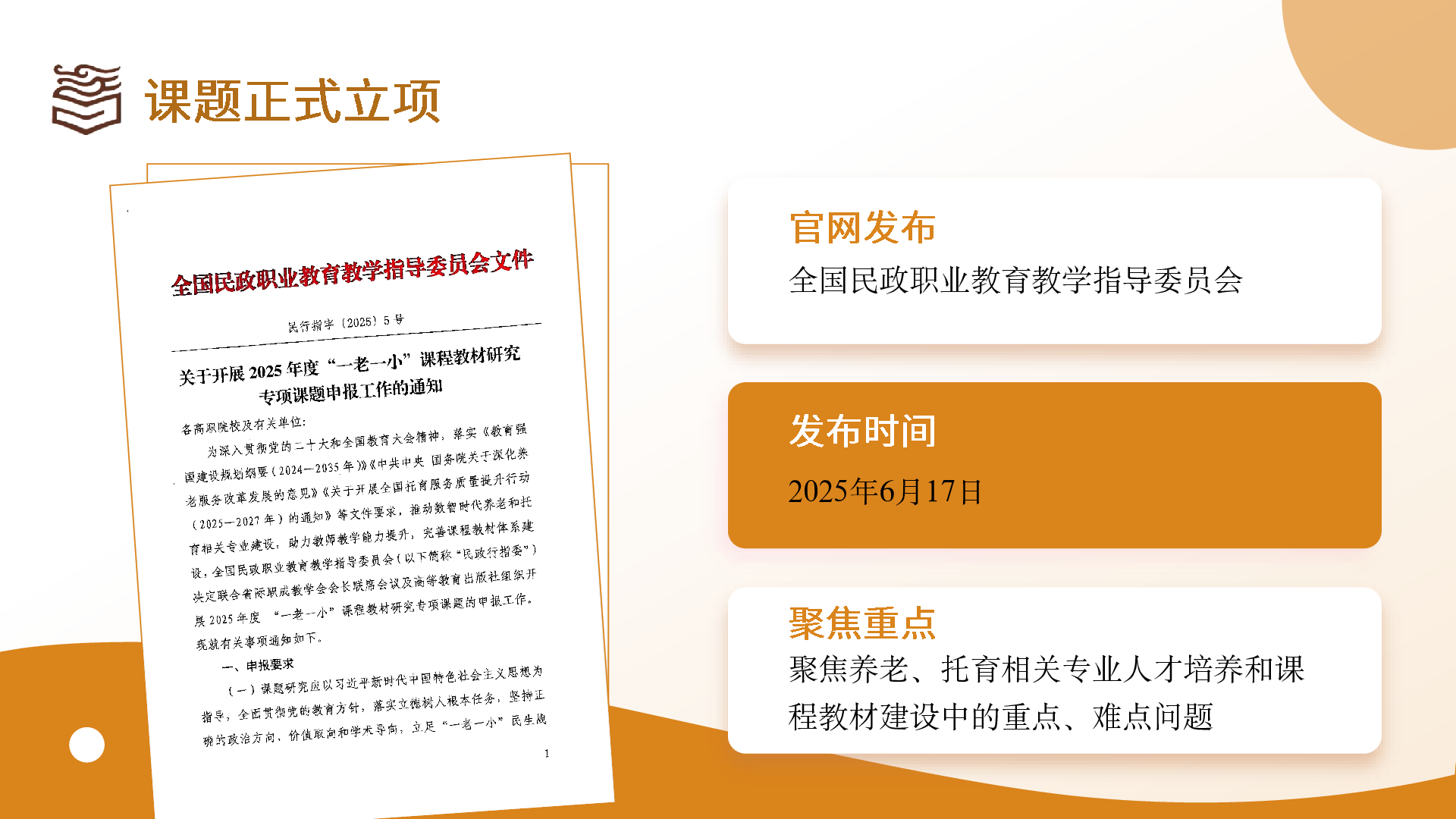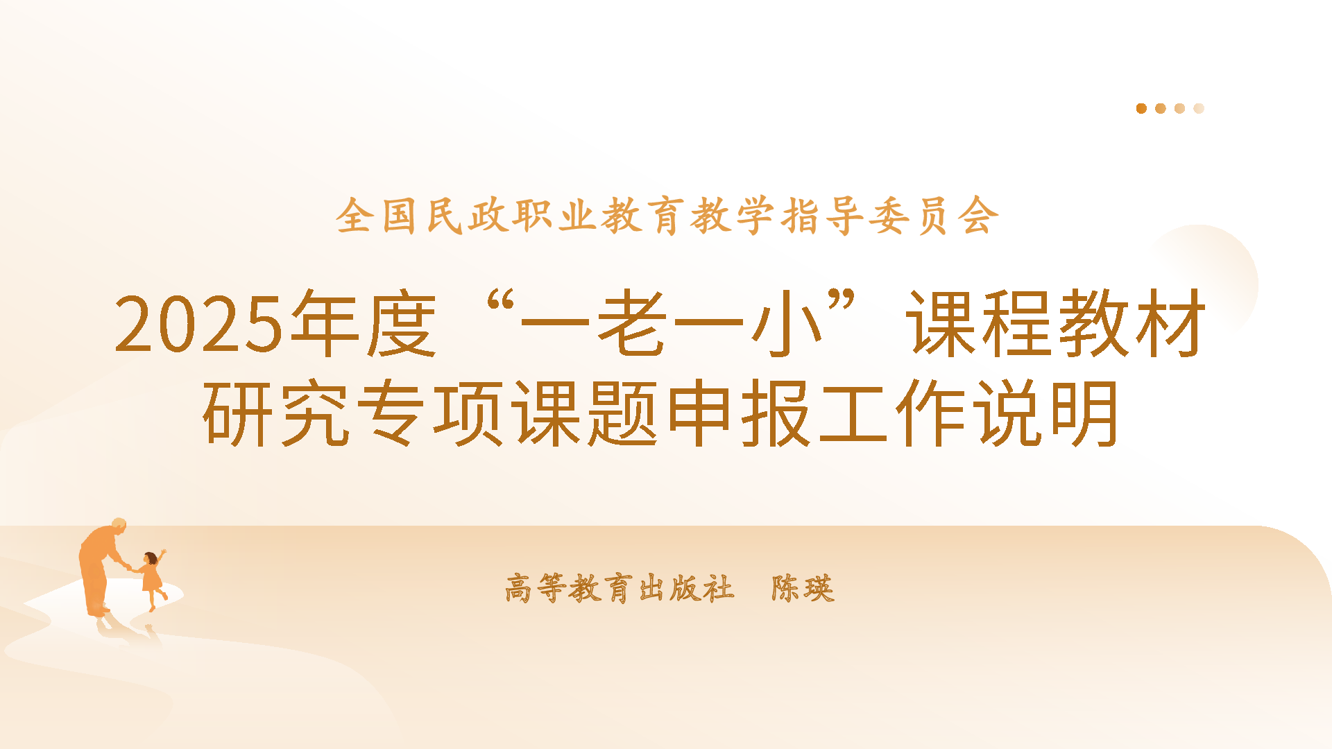 为深入贯彻党的二十大和全国教育大会精神,落实《教育强国建设规划纲要(2024—2035年)》《中共中央 国务院关于深化养老服务改革发展的意见》《关于开展全国托育服务质量提升行动(2025—2027年)的通知》等文件要求,推动数智时代养老和托育相关专业建设,助力教师教学能力提升,完善课程教材体系建设,全国民政职业教育教学指导委员会(以下简称“民政行指委”)决定联合省际职成教学会会长联席会议及高等教育出版社组织开展2025年度 “一老一小”课程教材研究专项课题的申报工作。现就有关事项通知如下。