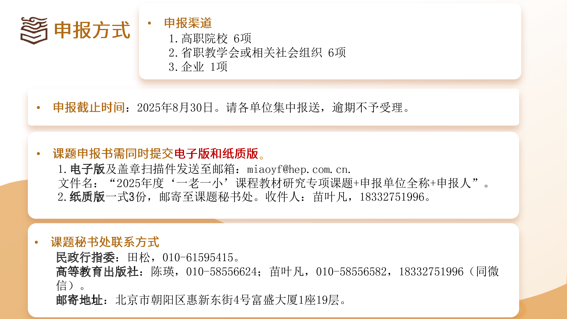 1.电子版及盖章扫描件发送至邮箱:miaoyf@hep.com.cn。文件名:“2025年度‘一老一小’课程教材研究专项课题+申报单位全称+申报人”。