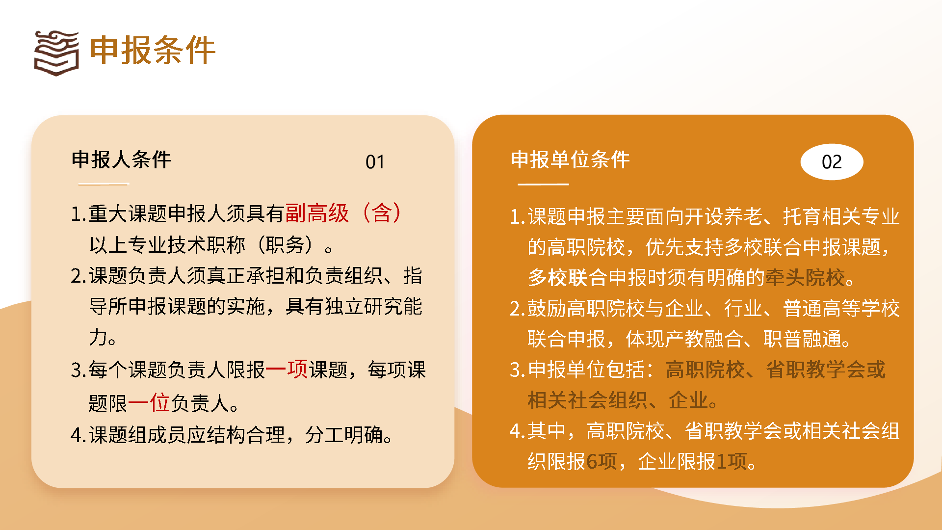 (五)课题申报主要面向开设养老、托育相关专业的高职院校,优先支持多校联合申报课题,多校联合申报时须有明确的牵头院校。鼓励高职院校与企业、行业、普通高等学校联合申报,体现产教融合、职普融通。