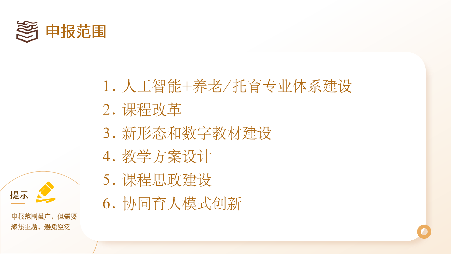 (七)申报单位包括:高职院校、省职教学会或相关社会组织、企业。其中,高职院校、省职教学会或相关社会组织限报6项,企业限报1项。填写《2025年度“一老一小”课程教材研究专项课题申报汇总表》(见附件3),按要求发送邮箱。