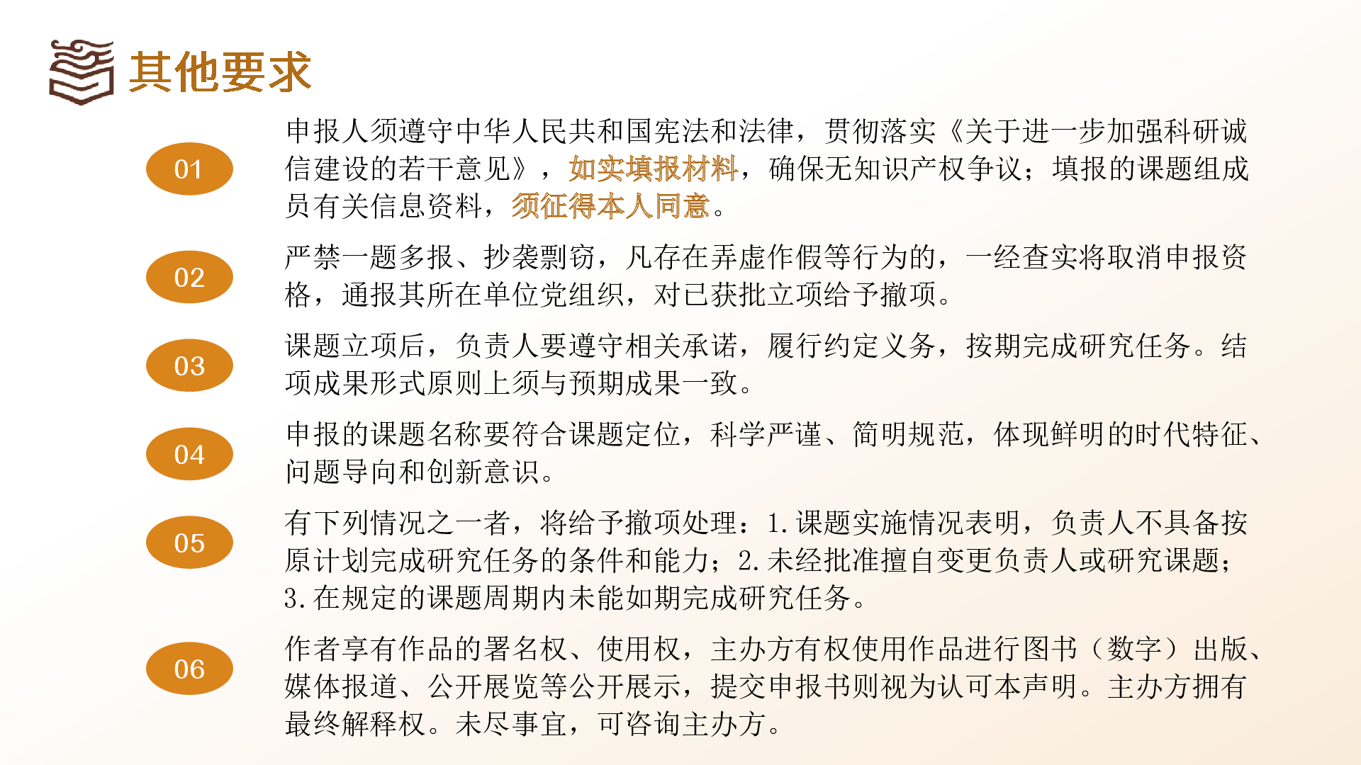 (一)申报人须遵守中华人民共和国宪法和法律,贯彻落实《关于进一步加强科研诚信建设的若干意见》,如实填报材料,确保无知识产权争议;填报的课题组成员有关信息资料,须征得本人同意。